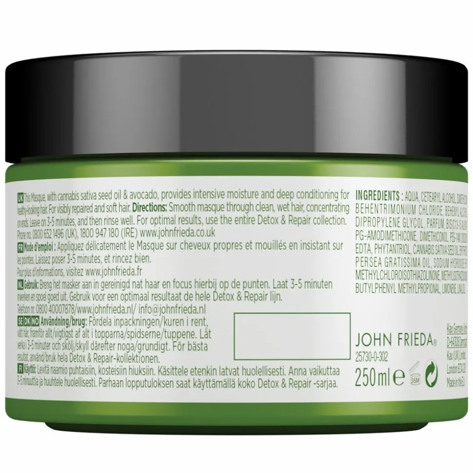 John Frieda Detox & Repair Masker is speciaal ontwikkeld voor droog, gestresst of beschadigd haar. Dit masker, verrijkt met cannabis sativa zaad olie & avocado, biedt intensieve hydratatie en diepe verzorging voor gezond ogend haar. Voor zichtbaar hersteld en zacht haar.