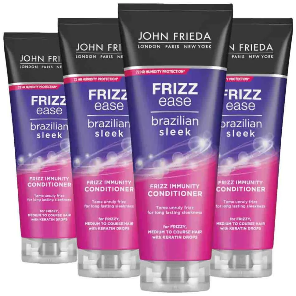 John Frieda Brazilian Sleek conditioner is verrijkt met keratinedruppels en Frizz Immunity Complex. Het voedt het haar en houdt vocht vast, tegelijkertijd helpt deze conditioner bij elk gebruik om geleidelijk immuniteit voor pluis op te bouwen zodat het haar makkelijk te stylen is. Het resultaat is een langdurige gladde, glanzende stijl. Deze lijn bouwt vanaf het eerste gebruik een sterke verdediging op tegen vochtigheid die tot 72 uur houdt, om te voorkomen dat pluis je stijl verpest. Geschikt voor alle soorten pluizig haar. Veilig voor gebruik op gekleurd haar. *Bij gebruik van de hele lijn.