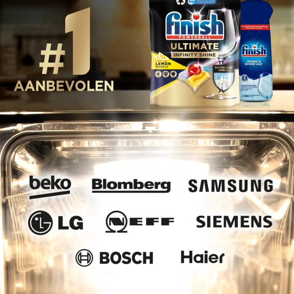 - Meest aanbevolen reinigingsmiddel, op basis van gerenommeerde vaatwasmachine- en glasfabrikant die Finish aanbevelen