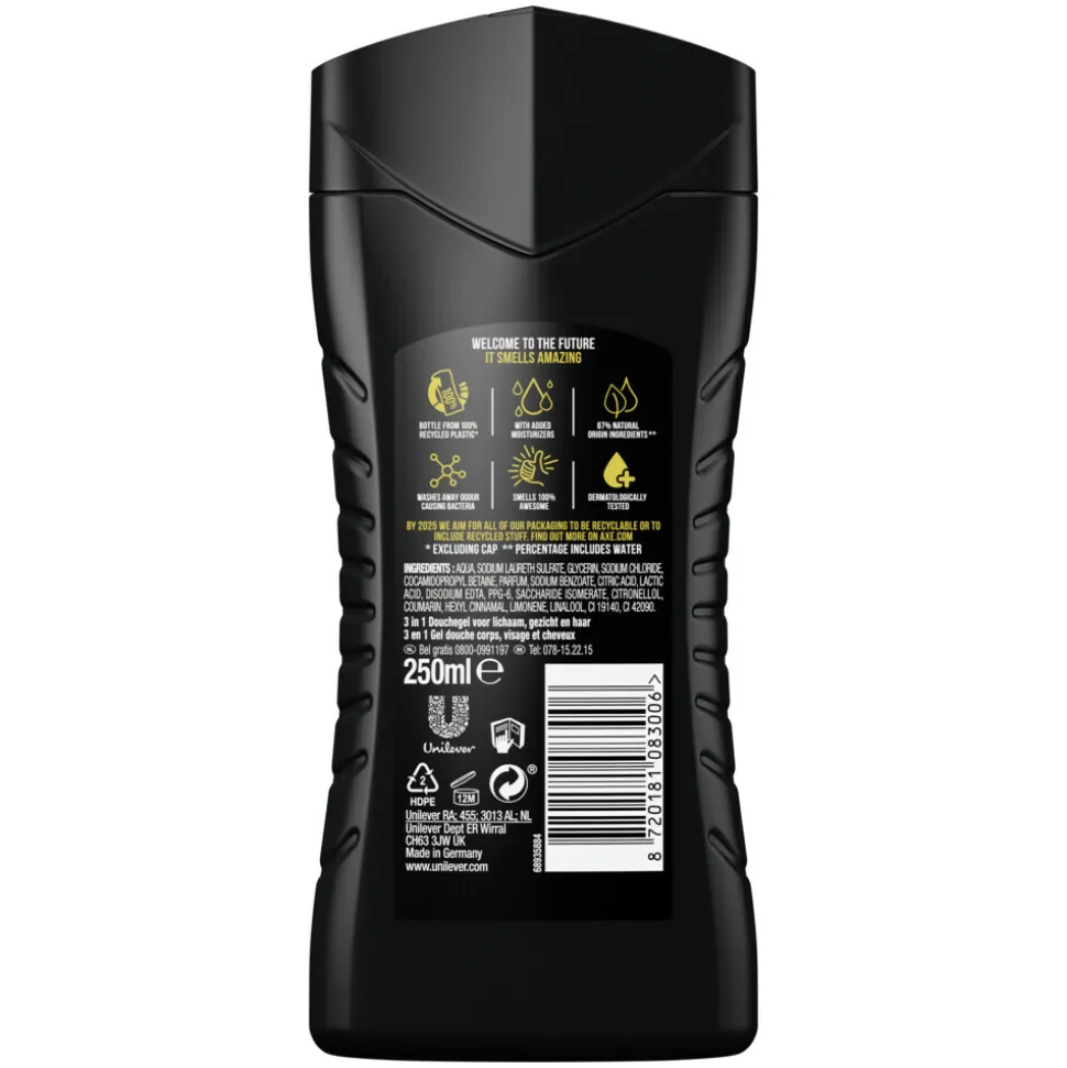 - AXE douchegel is verpakt in een 100% gerecyclede en recyclebare fles