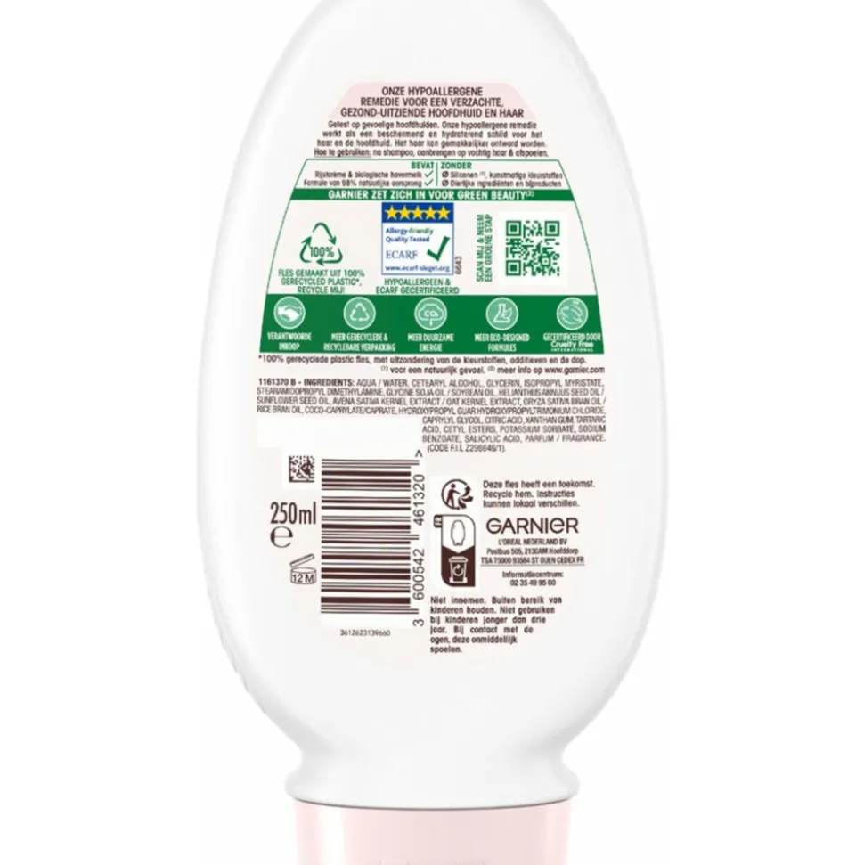Loving Blends Milde Haver Conditioner is een hypoallergene conditioner, speciaal ontwikkeld voor normaal haar en de gevoelige hoofdhuid. Garnier Loving Blends heeft een formule samengesteld die twee zachte ingrediënten combineert: Rijstcrème en havermelk. Dagelijks gebruik van deze milde formule maakt het haar zachter en soepeler. De hoofdhuid is onmiddellijk gekalmeerd en minder gevoelig. Breng de conditioner aan op de gehele lengte van je gewassen haar, masseer zachtjes in en spoel het uit voor een optimaal eindresultaat.