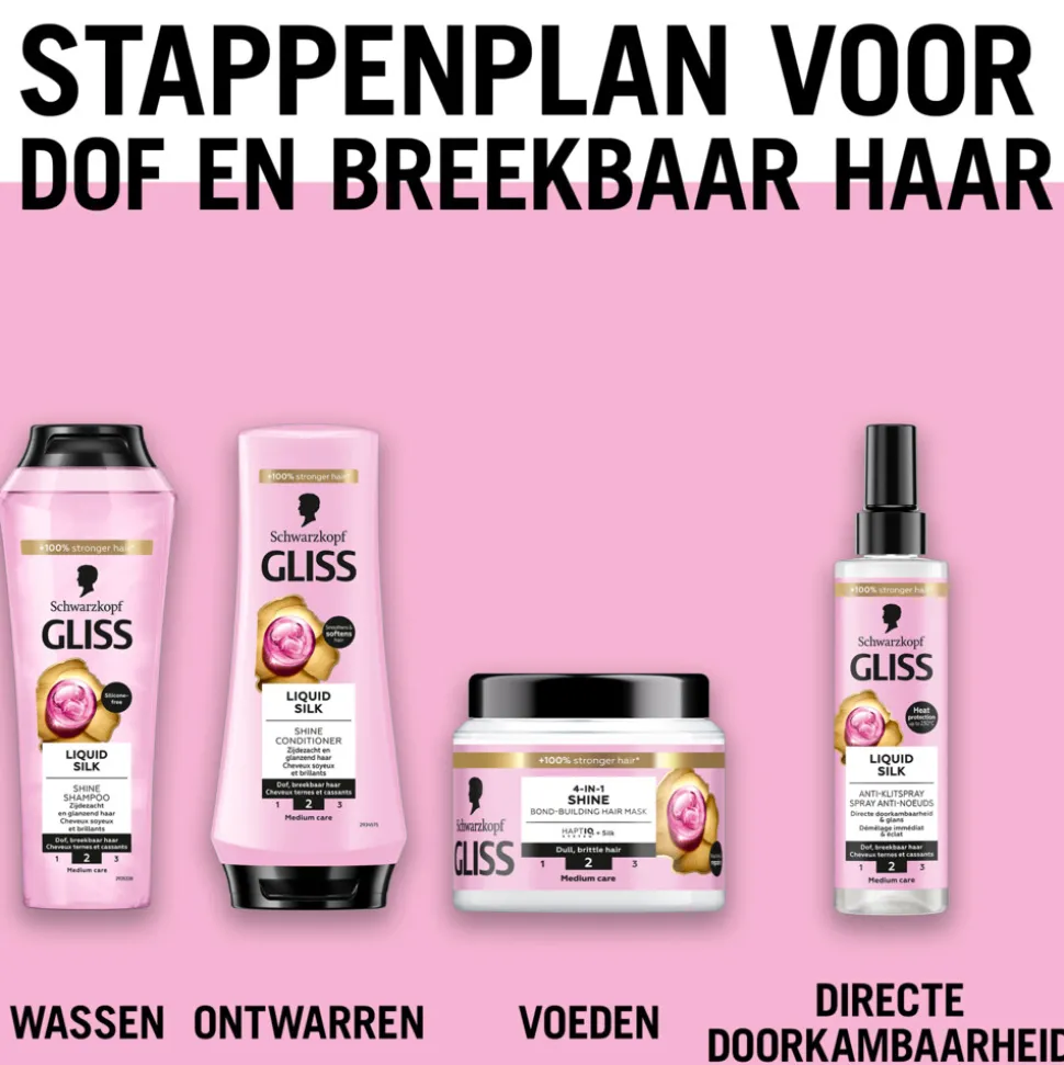 Om beschadigd, breekbaar of dof haar te herstellen, is een aangepaste verzorging nodig. De Liquid Silk lijn van Gliss herstelt het haar en maakt het zacht en glanzend. Voor een optimaal resultaat, raden wij het gebruik van ons drie stappenplan aan: