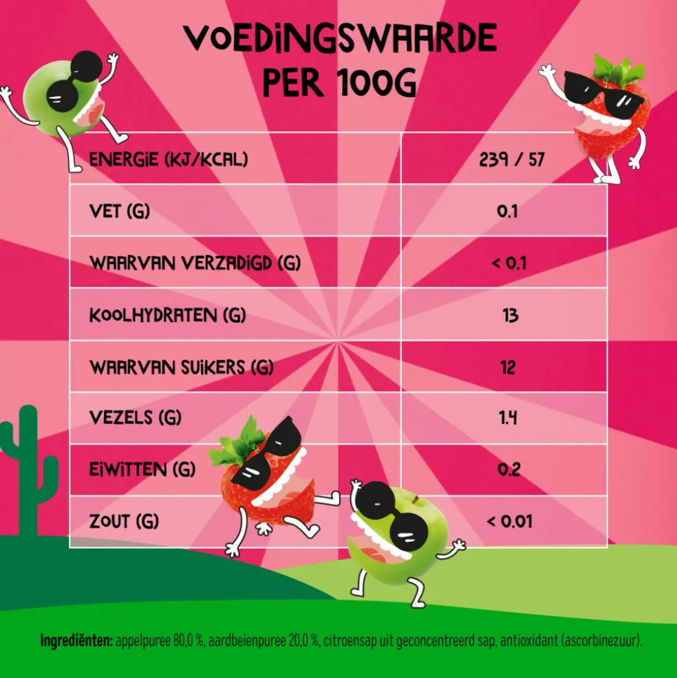 appelpuree 80,0 %, aardbeienpuree 20,0 %, citroensap uit geconcentreerd sap, antioxidant (ascorbinezuur).
