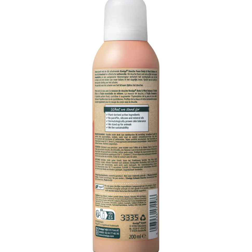 Transformeer je dagelijkse doucheroutine tot een waardevol harmoniemoment met deze douche foam Body & Mind Balance. Of je nu worstelt met een opgejaagd gevoel of juist kampt met verminderde energie, de Body & Mind balance verzorgingslijn is speciaal ontwikkeld om te ondersteunen bij herstel van jouw innerlijke harmonie. Het omarmt je met de rustgevende kracht van irisextract en vetiverolie, terwijl de verfijnde bloemige geur je terugbrengt naar een staat van evenwicht.Deze douche foam bied je een hydraterende wolk van schuim voor een heerlijk ontspannend spa-moment. Ervaar de tedere omarming op je huid en geniet van de revitaliserende impact op zowel je lichaam als geest.Ook geschikt voor het scheren van het lichaam tijdens het douchen. Probeer ook de andere producten van Kneipp Body & Mind Balance zoals de douchegel, badolie, body lotion of body crème.