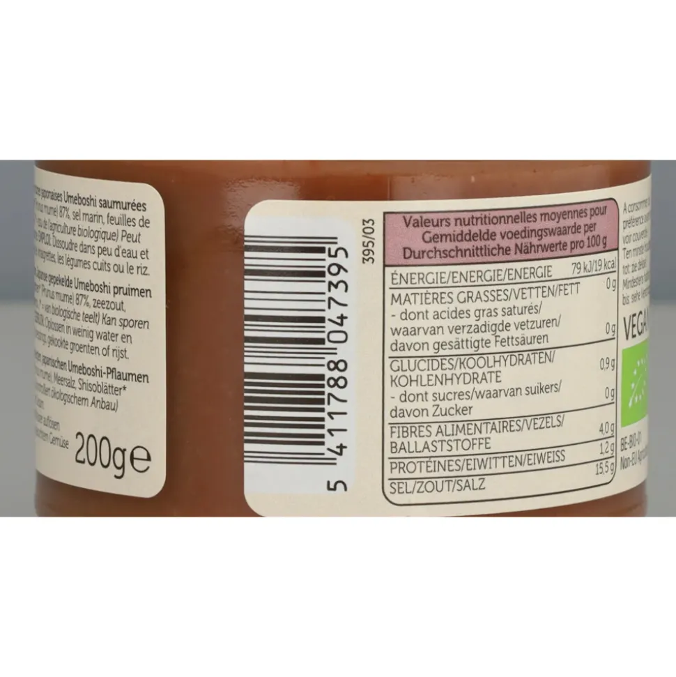 Ume pruimen* (Prunus mume) 87%, zeezout, Shiso* blad (Perilla frutescens).