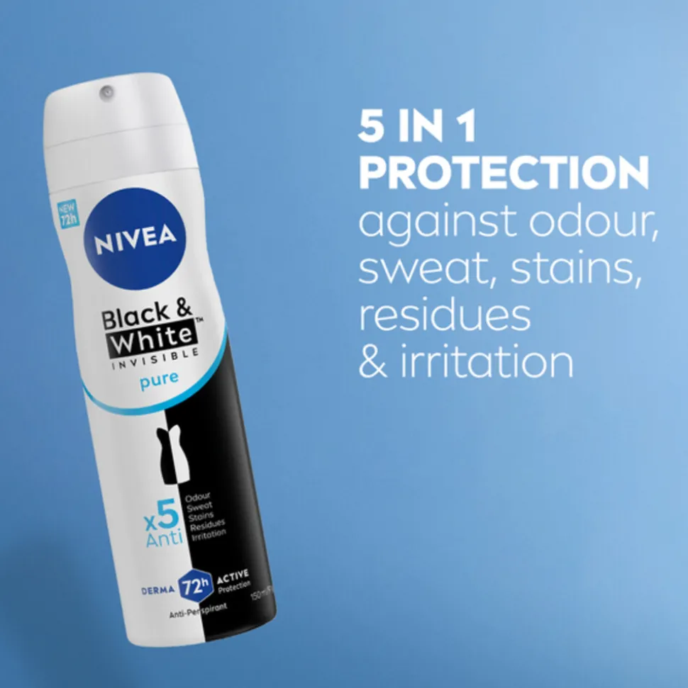 NIVEA Black & White Invisible Pure Anti-Transpirant Spray is de ideale keuze voor de vrouw die op zoek is naar betrouwbare bescherming zonder vlekken. Deze deodorant is speciaal ontworpen om witte vlekken op zwarte kleding te voorkomen en gele vlekken op witte kleding tegen te gaan, dankzij de unieke en gepatenteerde anti-vlekken technologie. Dit maakt het perfect voor dagelijks gebruik, zodat je zonder zorgen je favoriete kleding kunt dragen.