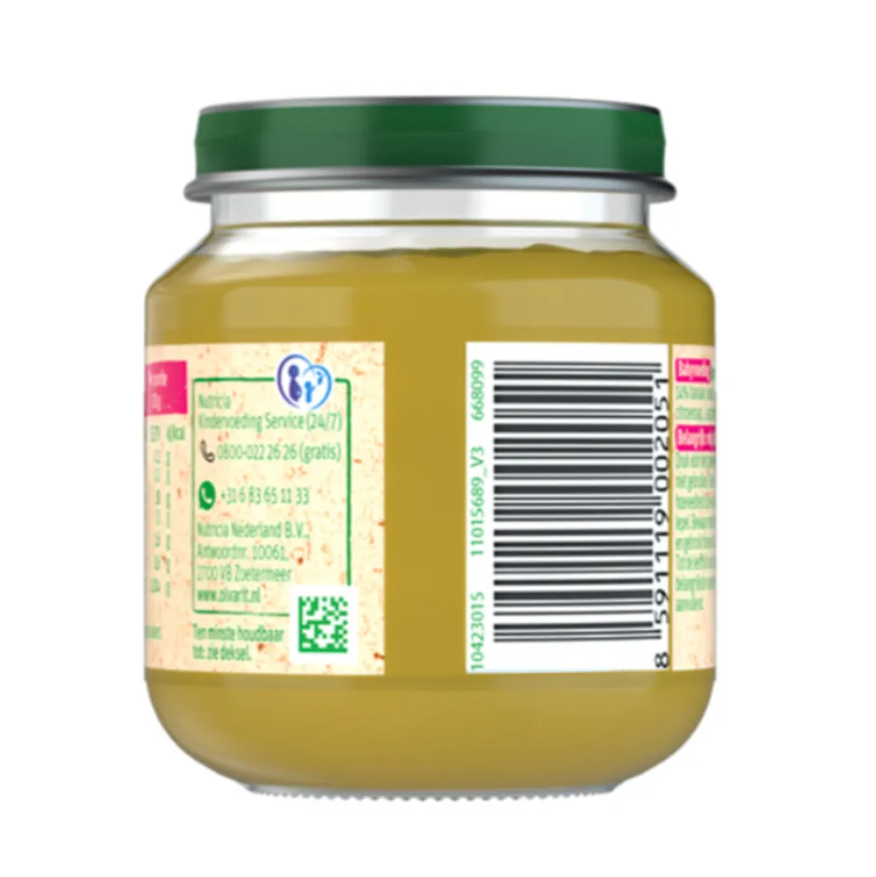 Olvarit fruithapje 4m kun je geven tot de leeftijd van 6 maanden, daarna stap je over naar de 6m potjes. Smaakontwikkeling zorgt ervoor dat je kindje, door veel te proeven, went aan verschillende smaakjes. Wat je kind nu eet en leert eten, is bepalend voor de rest van zijn leven. Vanaf 12 maanden worden kinderen steeds kritischer als het om eten gaat en krijgen ze steeds meer een uitgesproken smaak. Daarom is het belangrijk om je kind al voor de leeftijd van 1 jaar te stimuleren met zo veel mogelijk uiteenlopende gerechten. Je kindje moet een nieuwe smaak wel 5 tot 10 keer proeven voordat hij er echt aan gewend is. Dus geef het niet op als je kind iets de eerste keer niet lust. Blijf het proberen! Wissel verschillende smaken fruit en groente zoveel mogelijk af. Het Olvarit assortiment bevat meer dan 100 soorten fruit en maaltijden.