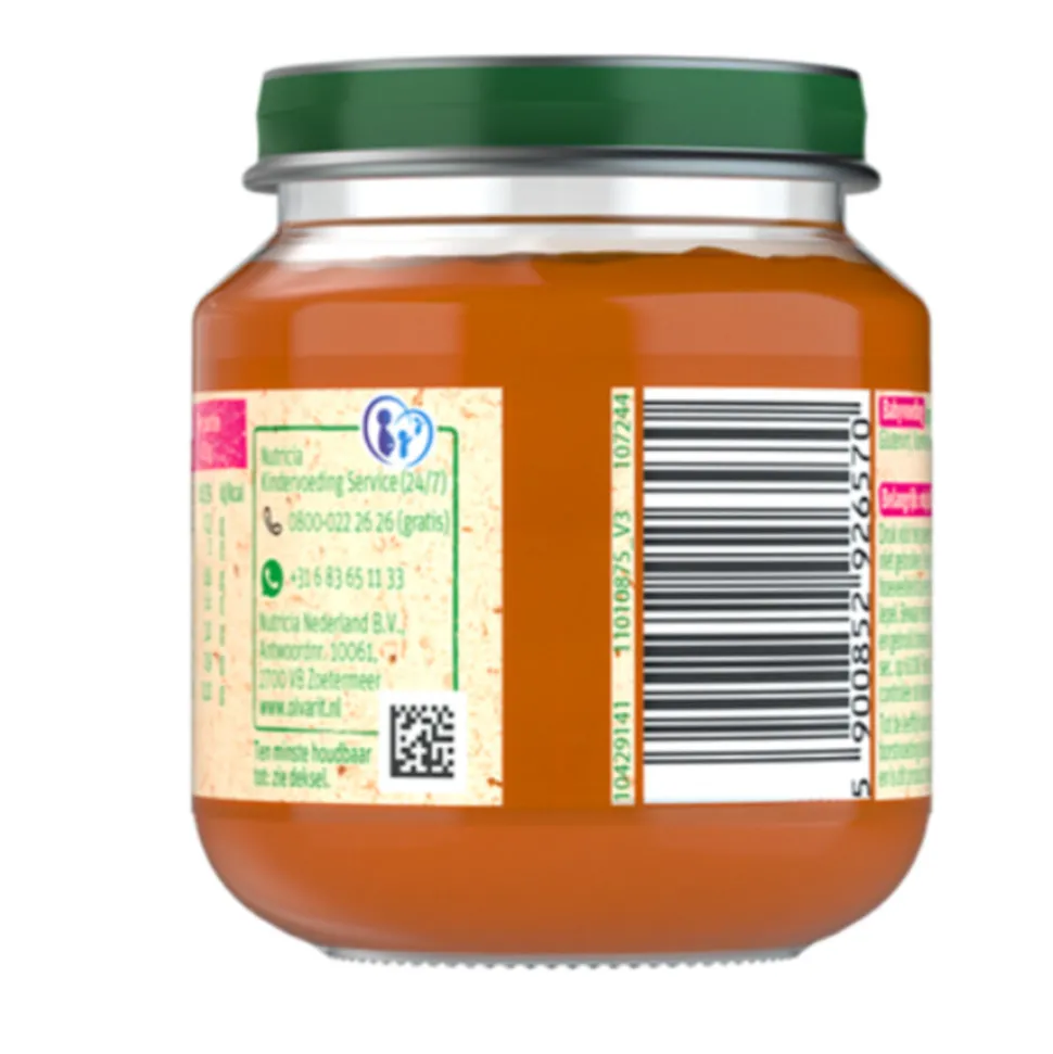 Olvarit groentehapje 4m kun je geven tot de leeftijd van 6 maanden, daarna stap je over naar de 6m potjes. Smaakontwikkeling zorgt ervoor dat je kindje, door veel te proeven, went aan verschillende smaakjes. Wat je kind nu eet en leert eten, is bepalend voor de rest van zijn leven. Vanaf 12 maanden worden kinderen steeds kritischer als het om eten gaat en krijgen ze steeds meer een uitgesproken smaak. Daarom is het belangrijk om je kind al voor de leeftijd van 1 jaar te stimuleren met zo veel mogelijk uiteenlopende gerechten. Je kindje moet een nieuwe smaak wel 5 tot 10 keer proeven voordat hij er echt aan gewend is. Dus geef het niet op als je kind iets de eerste keer niet lust. Blijf het proberen! Wissel verschillende smaken fruit en groente zoveel mogelijk af. Het Olvarit assortiment bevat meer dan 100 soorten fruit en maaltijden.