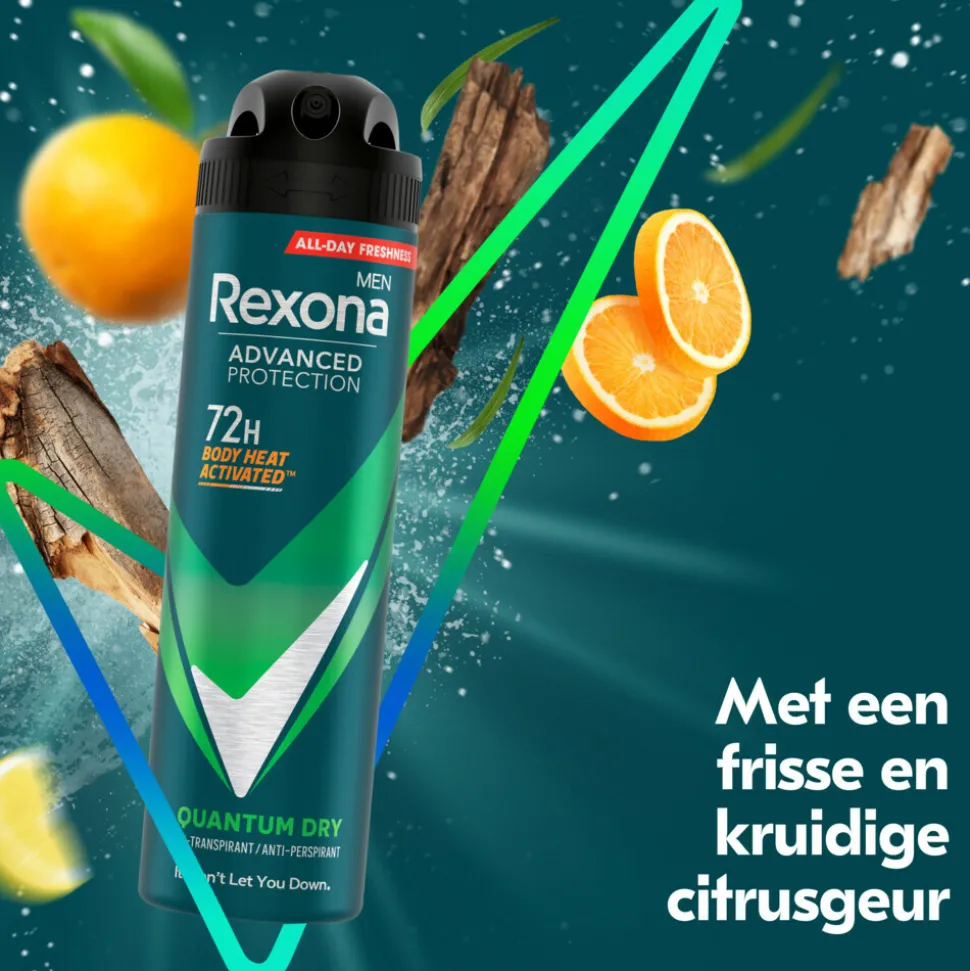 Rexona Men Advanced Protection Quantum Dry Anti-Transpirant Spray bevat de innovatieve Body Heat Activated Technologie van Rexona, die frisse geur afgeeft wanneer je die het meest nodig hebt. Zo voel je je de hele dag lekker fris. Het werkt als volgt; unieke microcapsules hechten zich aan het oppervlak van jouw huid. Bij beweging breken de microcapsules open en komt er een frisse citrusgeur met kruidige en houtachtige noten vrij. Dus hoe meer je beweegt, hoe meer het beschermt. Ervaar de hele dag door frisheid en 72 uur bescherming van zweet, geur en vlekken. Rexona, daar kun je op vertrouwen.