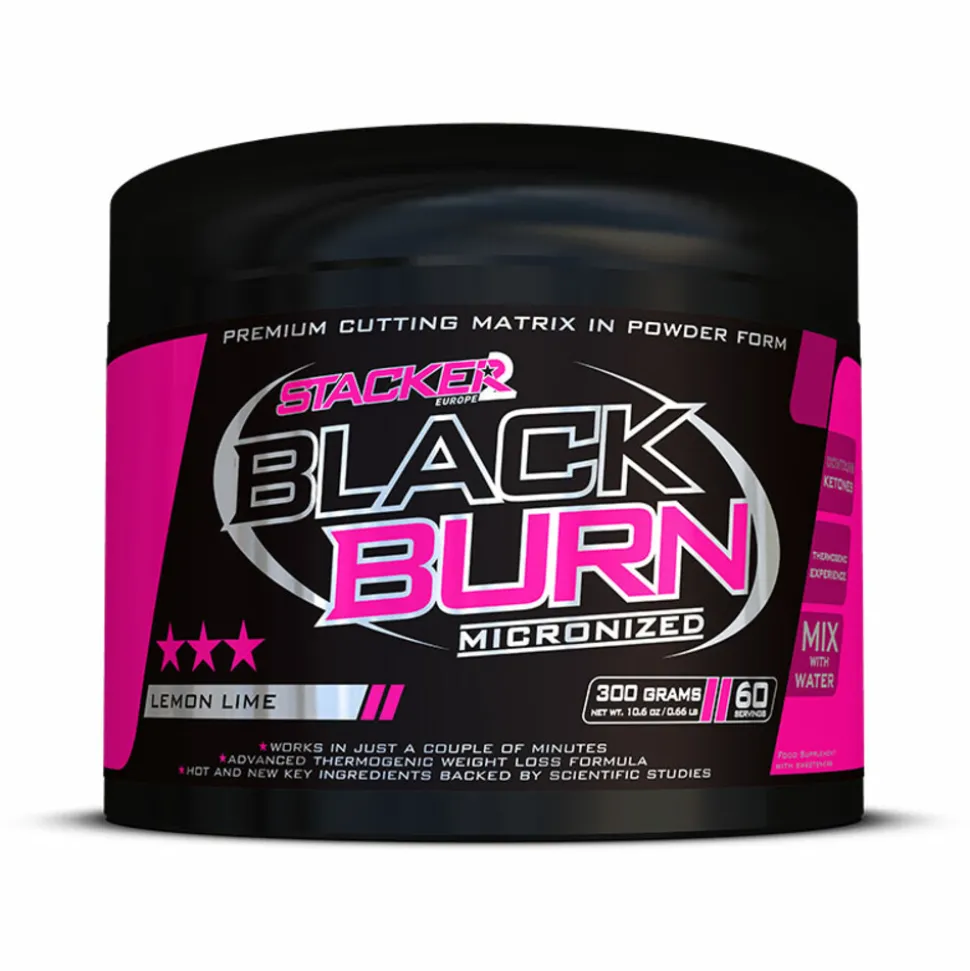 Black Burn Micronized bevat een nooit eerder gebruikte combinatie van 10 ingrediënten om jouw stofwisseling op te jagen. Naast de al eerder genoemde ketonen vind je Garcinia Cambogia extract, Choline, Ginseng, verschillende theesoorten, guarana en peperextracten. In tegenstelling tot andere afslankproducten van het Stacker assortiment bestaat een dosering Black Burn Micronized niet uit capsules maar uit 5 gram poeder, welke je oplost in een glas water. Het voordeel van poeder is dat het product sneller wordt opgenomen door je lichaam. Een gedeelte van de extracten neem je al op via je gehemelte. Daardoor voel je soms al binnen enkele minuten dat Black Burn Micronized werkt. Naast de snellere werking is het met poeder ook makkelijker om anders te doseren (bijvoorbeeld een halve dosering ’s avonds om nog makkelijk in slaap te kunnen vallen).