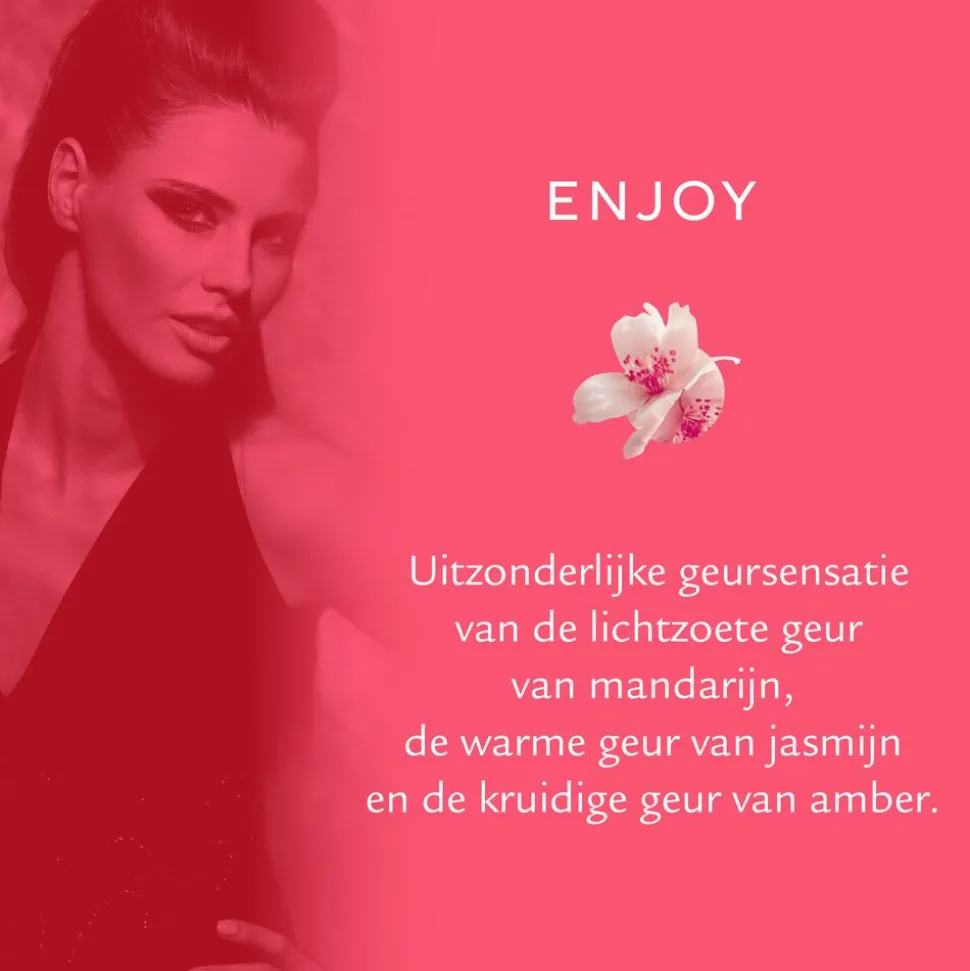 Geniet van de uitzonderlijke, langdurige geur van Enjoy waarin zoete, warme en kruidige geurnoten met elkaar worden gecombineerd