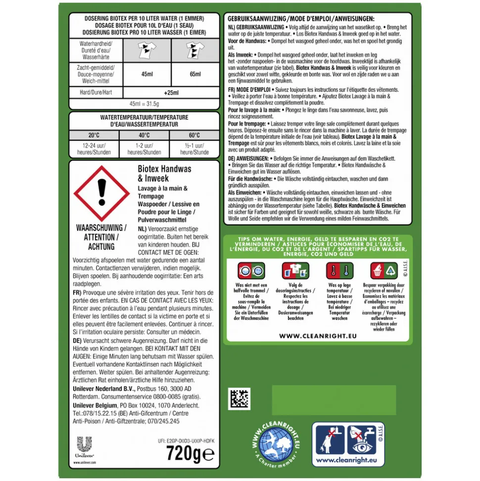 Biotex Handwas & Inweek Waspoeder is speciaal ontwikkeld voor een natuurlijke en veilige behandeling van je kleding.