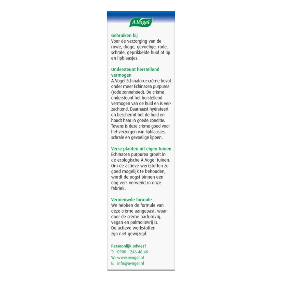 A.Vogel Crème Echinaforce huid is een cosmetische crème. Crème Echinaforce bevat onder meer Echinacea purpurea (rode zonnehoed). Echinaforce crème ondersteunt het herstellend vermogen van de huid. Daarnaast verzorgt hydrateert en beschermt Crème Echinaforce de huid en houdt de huid in goede conditie. Crème Echinaforce is ideaal bij gevoelige of geprikkelde plekjes op huid of lippen.