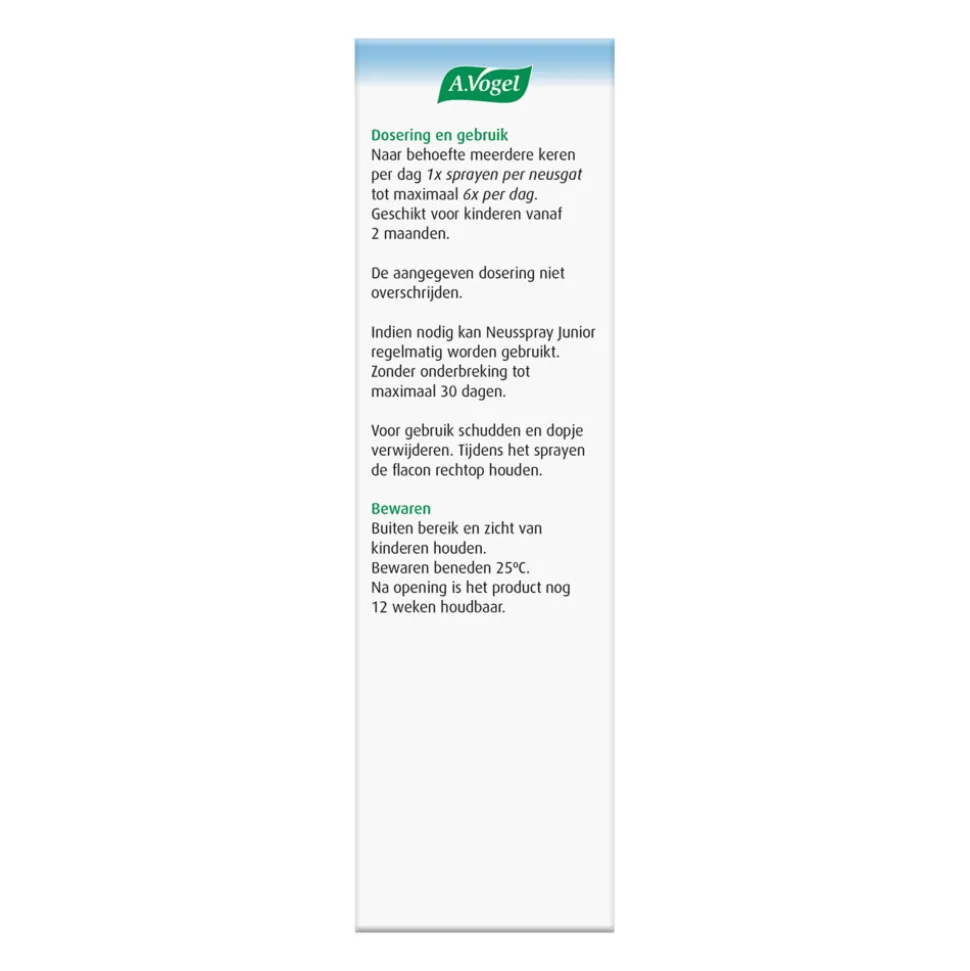 Indien nodig kan A.Vogel Junior Neusspray regelmatig worden gebruikt, zonder dat er gewenning optreedt. Uit hygiënisch oogpunt is het raadzaam elke verstuiver slechts door één kind te laten gebruiken