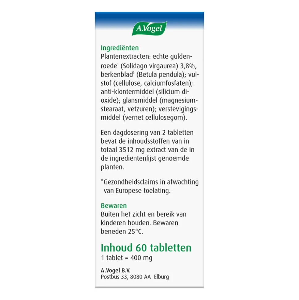 Plantenextracten: echte guldenroede (Solidago virgaurea) 3,8%, berkenblad (Betula pendula); vulstof (cellulose, calciumfosfaten); anti-klontermiddel (silicium dioxide); glansmiddel (magnesiumstearaat, vetzuren); verstevigingsmiddel (vernet cellulosegom).