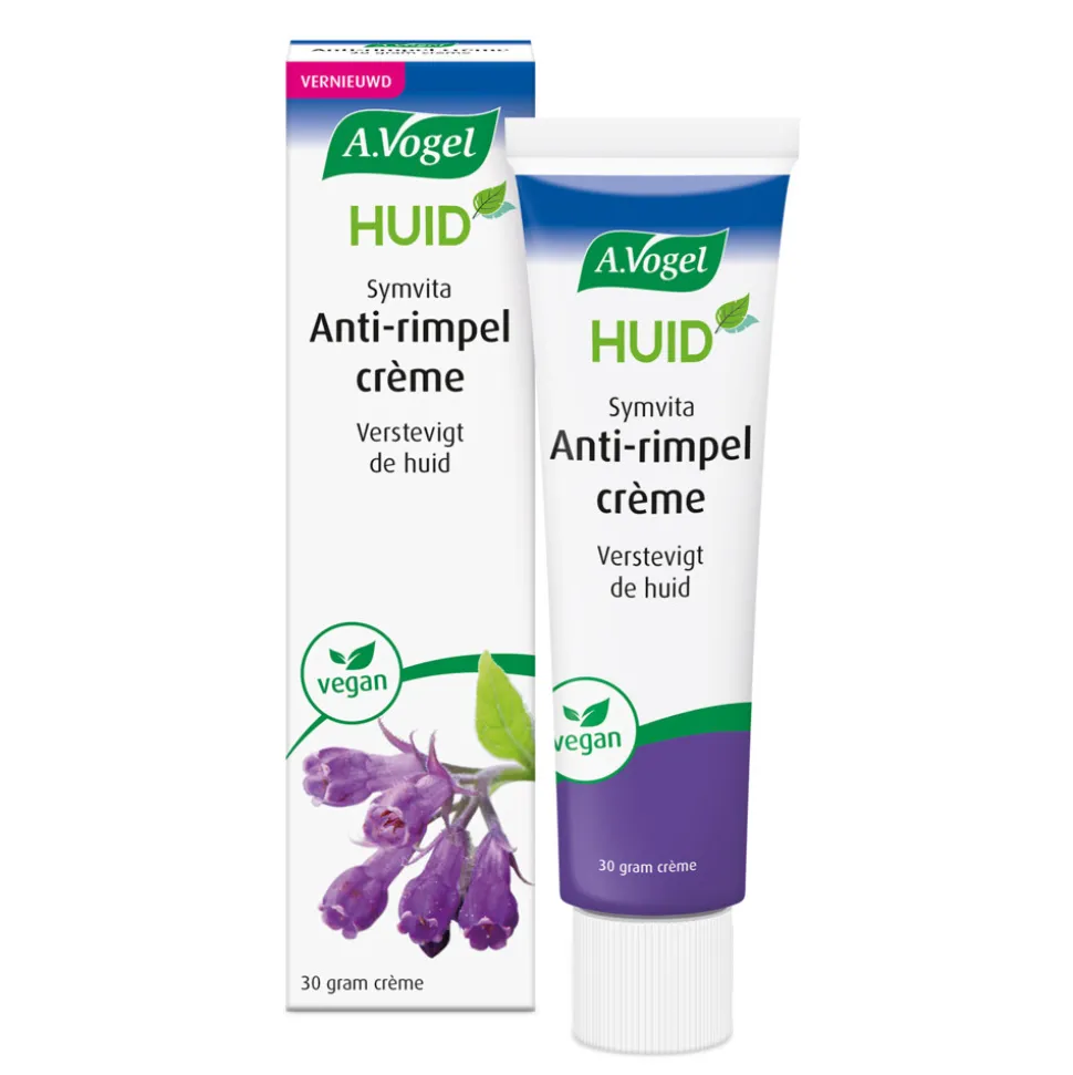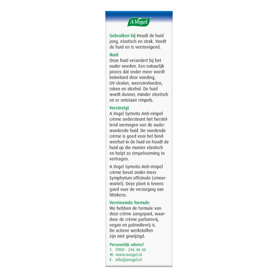 Symvita Anti-rimpel crème van A. Vogel ondersteunt het herstellend vermogen van de ouder wordende huid. De voedende crème houdt de huid elastisch. Het helpt rimpelvorming te vertragen en is goed voor het bindweefsel in de huid. De crème bevat onder meer Symphytum officinale (smeerwortel). Deze plant is tevens goed voor de verzorging van littekens.
