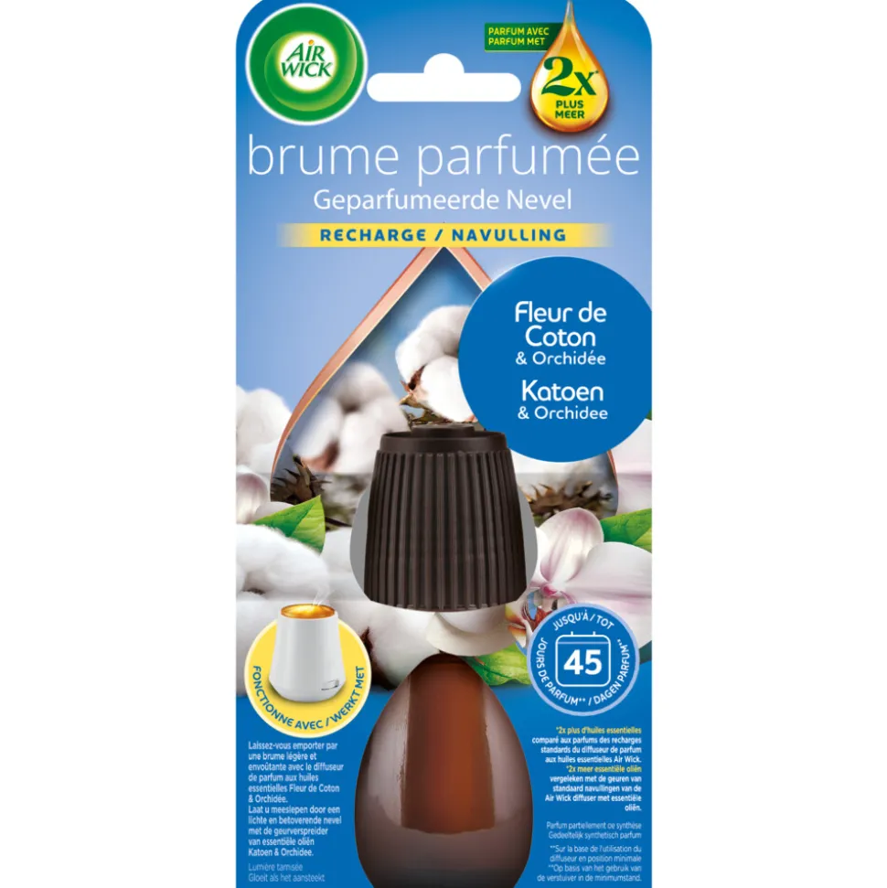De Air Wick Essential Mist Navulling Katoen & Orchidee vult je huis met een subtiele mix van zachte katoen en bloemige orchidee. De misttechnologie verspreidt geurige etherische oliën in fijne nevel, waardoor een rustgevende en natuurlijke sfeer ontstaat. De geur komt geleidelijk vrij en past zich aan je omgeving aan, zodat je langdurig kunt genieten van een frisse en aangename ambiance. Gebruik deze navulling met de Air Wick Essential Mist diffuser en transformeer je huis moeiteloos in een rustgevende oase.