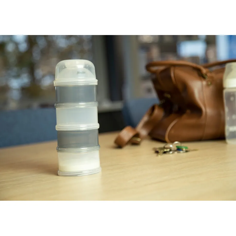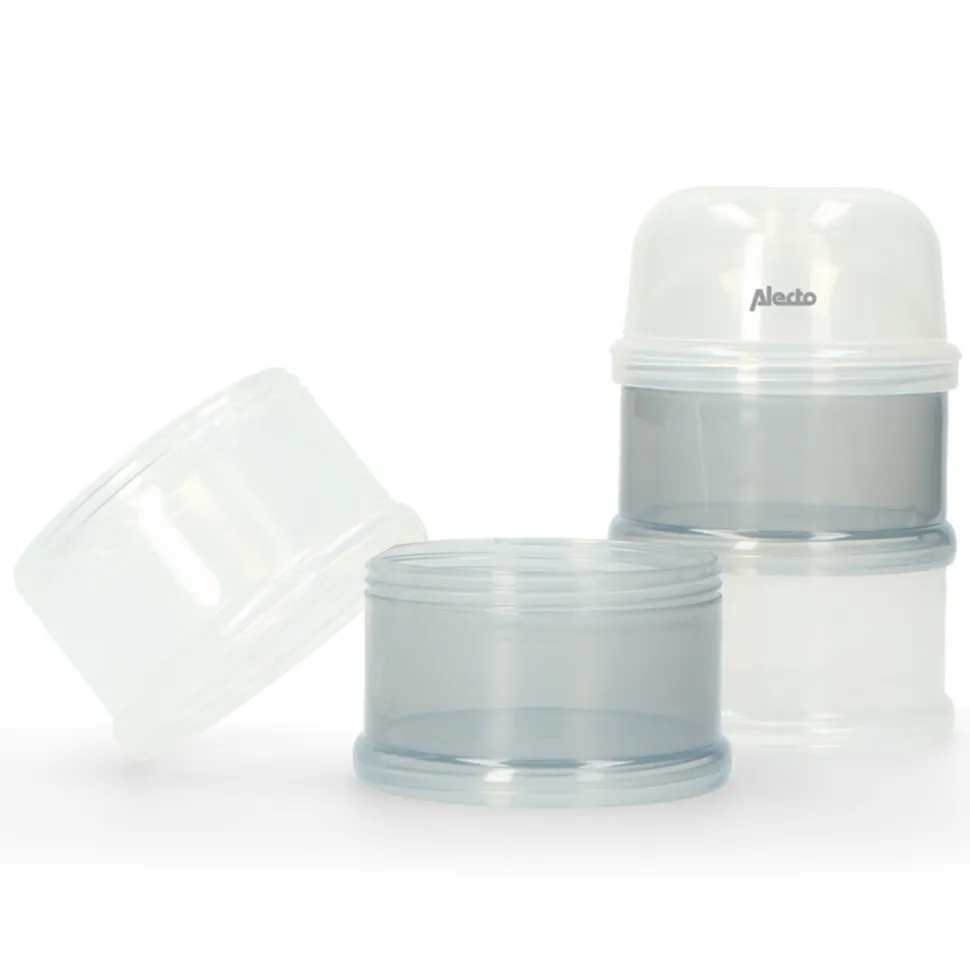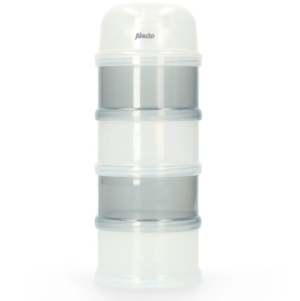 Alecto BF-4, Ideaal voor onderweg om melkpoeder mee te nemen of voor het bewaren van melkpoeder. 4 stapelbare bakjes met extra ruime inhoud (100 ml per bakje), Voorzien van solide schroefdraad, zodat bakjes gesloten blijven, Schroeftuit voor het makkelijk schenken van het poeder, makkelijk te gebruiken en schoon te maken, BPA-vrij.