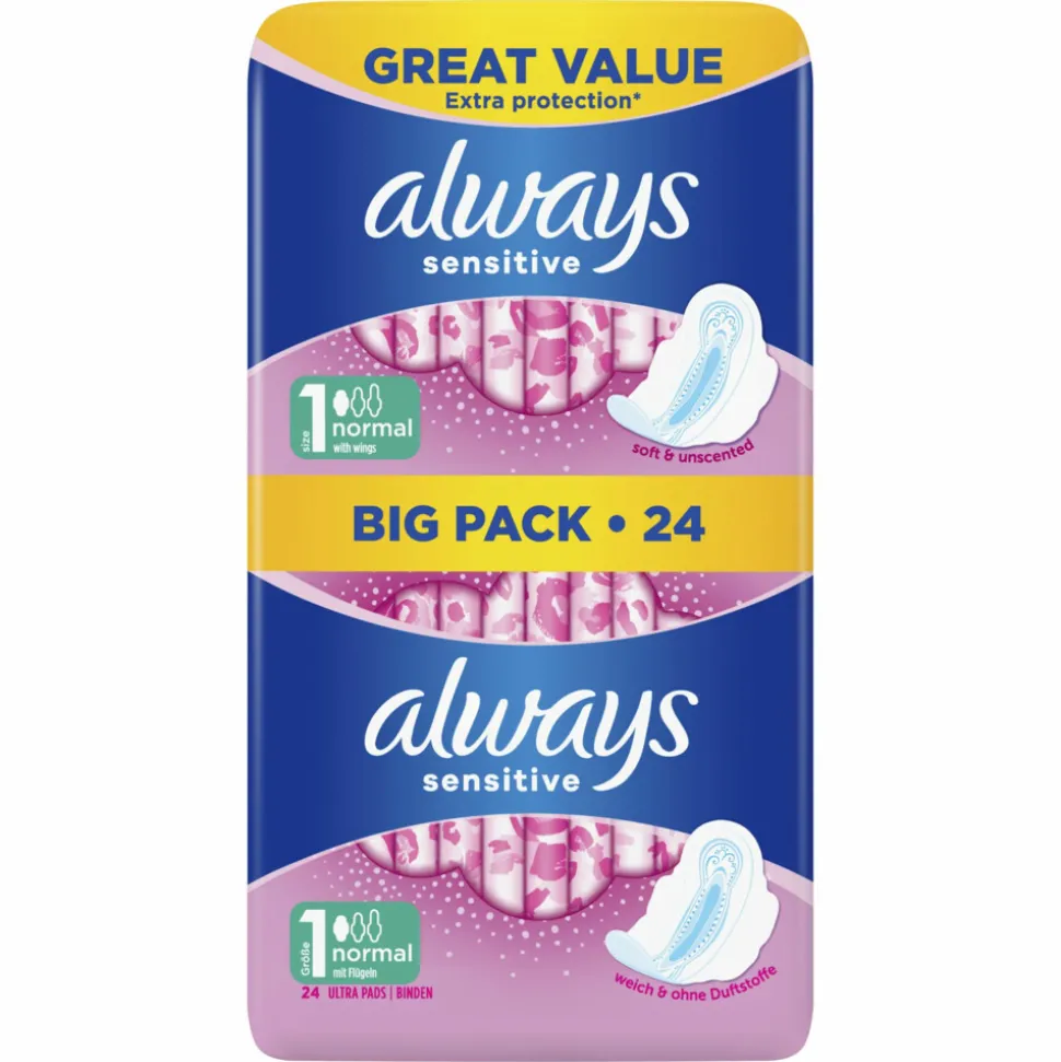 Een toplaag zo zacht als katoen (bevat geen katoen) en unieke comfortzones die je gevoelige huid extra comfort geven. Ideaal voor de dagen met een gemiddelde menstruatie. De Always Sensitive Ultra Normal Maandverbanden zijn de beste maandverbanden van het Always Sensitive gamma voor de dagen met een lichtere tot gemiddelde menstruatie. Het biedt je tot wel 100% bescherming tegen lekken.