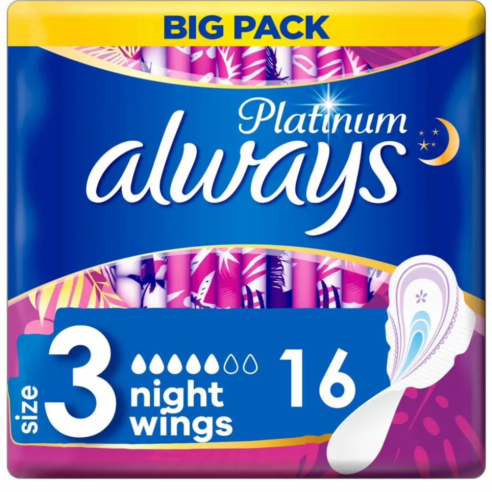 Always Platinum maandverband met ComfortLock vleugels is ontworpen voor een betere pasvorm* om lekken te voorkomen, op zijn plaats te blijven zitten en optimaal comfort te bieden. Met Always Platinum maandverband is je menstruatie het laatste waar je aan denkt.Always Platinum Day & Night (maat 3) met vleugels wordt aanbevolen voor gebruik overdag en ’s nachts en is ideaal voor een middelmatige tot zware menstruatie. Het design van Always Platinum Day & Night maandverbanden werd herzien voor een aangenamere ervaring bij gebruik overdag*. Probeer Always Platinum Secure Night (maat 4), het beste maandverband van Always Platinum voor bescherming ’s nachts.