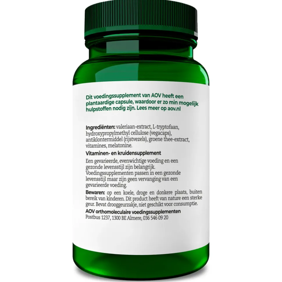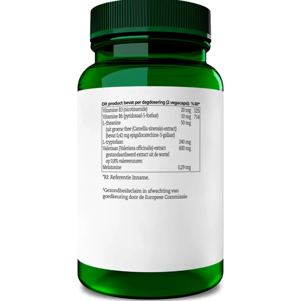 Valeriaan (Valeriana officinalis) extract, L-Tryptofaan, Veganistische capsule (Hydroxypropylmethylcellulose), Antiklontermiddel (Rijstvezels), Groene thee (Camellia sinensis) extract, Vitaminen, Melatonine.