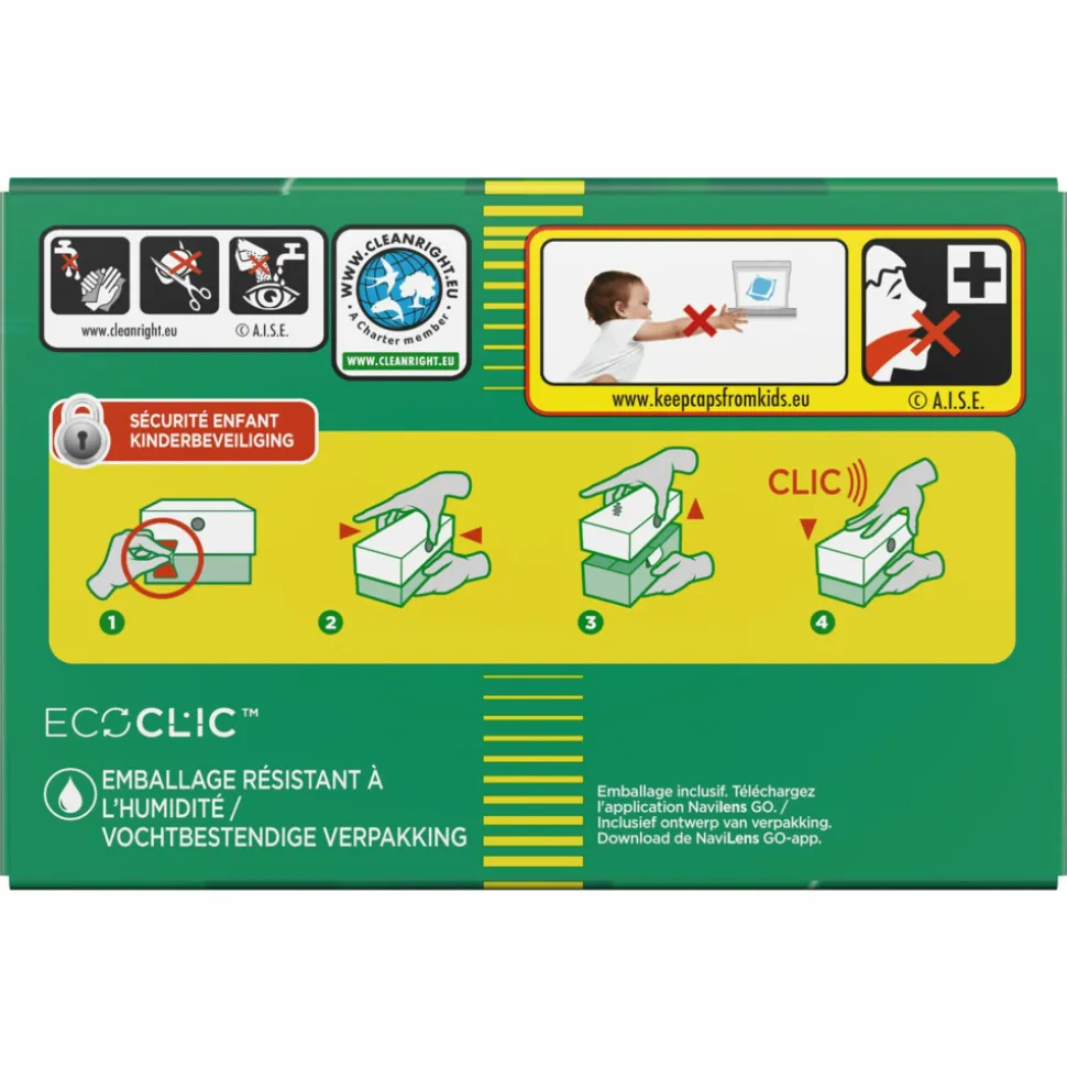 - ECOCLIC kartonnen doos: Zorg voor minder plastic met Ariel 3in1 PODS wasmiddelcapsules, verpakt in een recyclebare kartonnen doos die gemaakt is met 70% gerecyclede vezels en maximaal 5% plastic, ontworpen om je PODS te bewaren