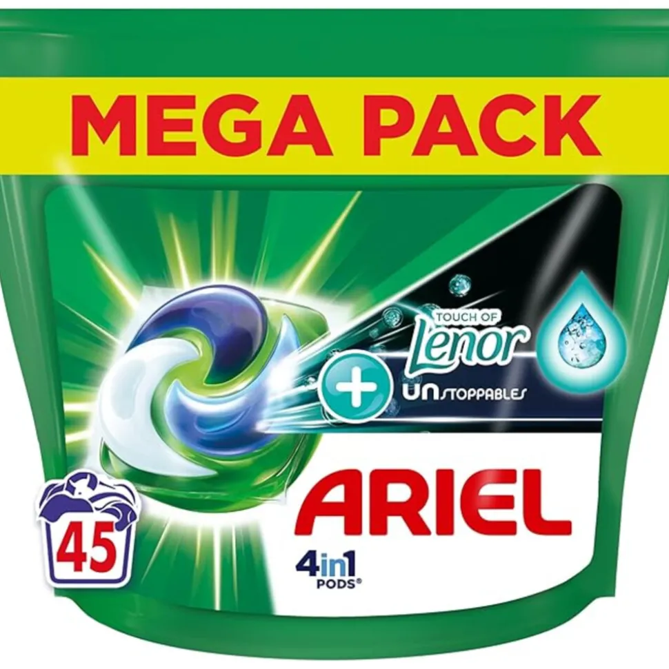 Ariel 4in1 PODS + Touch of Lenor Unstoppables combineren krachtige reiniging met langdurige frisheid in één handige capsule. Deze wasmiddelpods lossen snel op, zelfs in koud water, en zorgen voor een grondige was met behoud van frisheid tot wel een week. De extra grote verpakking bevat 45 pods en is ideaal voor wie efficiënt én duurzaam wil wassen.