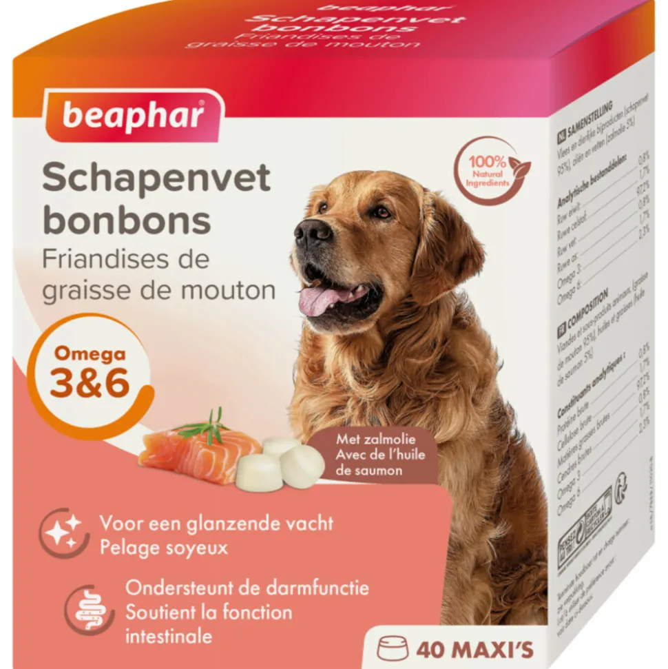 Een 100% natuurlijk aanvullend diervoeder voor honden. De smaakvolle bonbons met zalmolie zijn rijk aan Omega 3, 6 en 9, mineralen en sporenelementen. Zalmolie geeft energie, ondersteunt de hart- en bloedvaten, helpt gewrichten soepel houden en verzorgt huid en vacht. Beaphar schapenvetbonbons bevorderen de spijsvertering en helpen de natuurlijke weerstand te versterken.