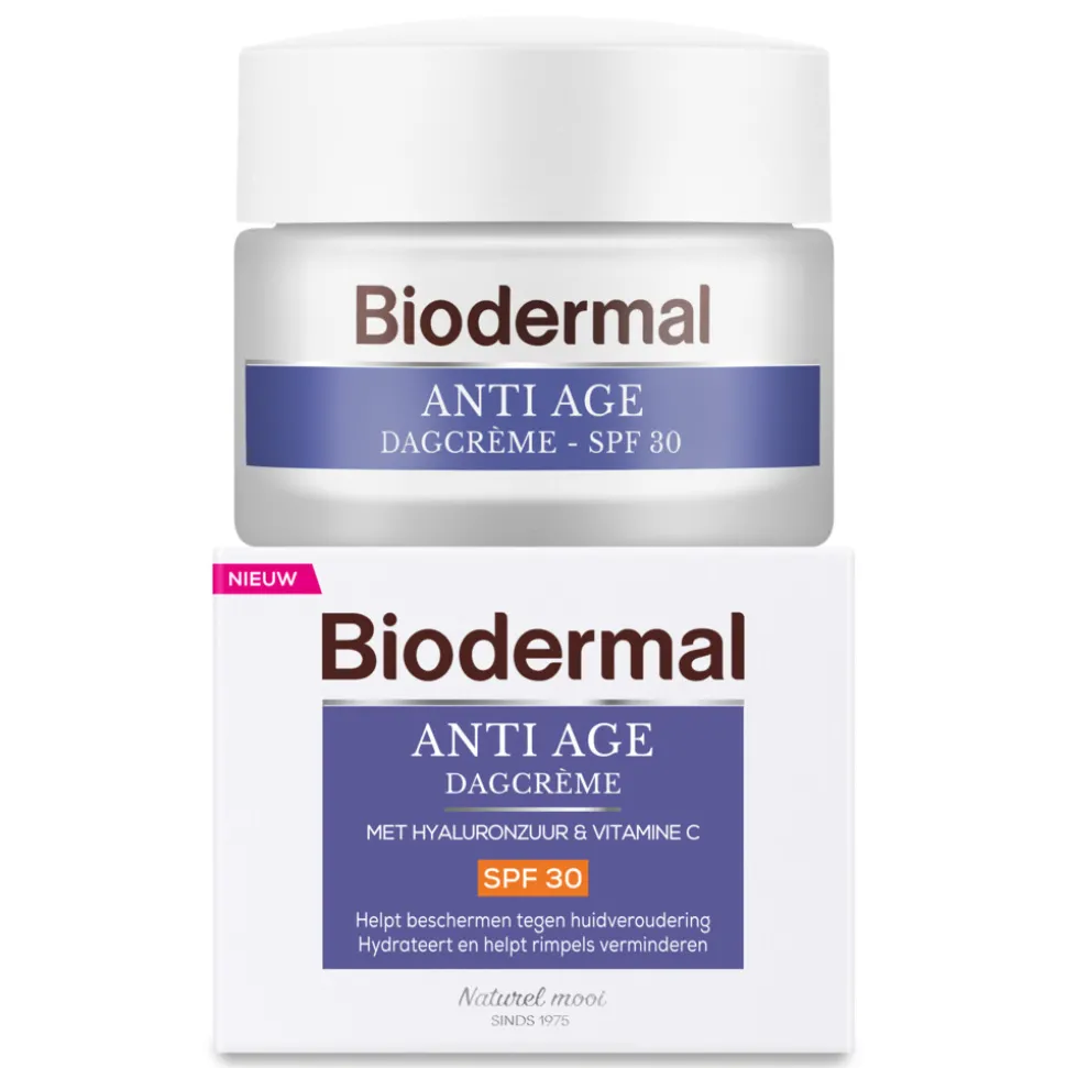 Biodermal Dagcrème Anti Age SPF30 biedt optimale verzorging én hoge bescherming tegen huidveroudering dankzij hyaluronzuur, vitamine C en SPF 30. UV-straling is één van de belangrijkste oorzaken van huidveroudering, daarom is SPF 30 is een waardevolle toevoeging aan de Anti Age Dagcrème. Biodermal Dagcrème Anti Age SPF30 is een effectieve en beschermende crème met een lichte textuur die snel intrekt. De formule met UVA- en UVB-filters beschermt de huid tegen UVA- en UVB-straling en daarmee tegen huidveroudering. De crème helpt fijne lijntjes en rimpels te verminderen en hydrateert de huid intensief. Het geeft de huid een meer gelijkmatige teint en huidtextuur. Daarnaast verbetert het de huidelasticiteit met als resultaat een gehydrateerde en stralende huid die strakker en gladder aanvoelt.