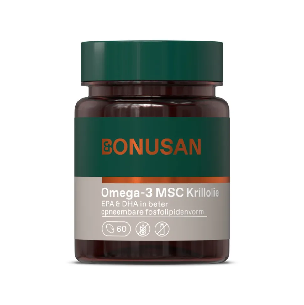 Bonusan Omega-3 MSC Krillolie is geproduceerd van vetzuren uit Arctische krill. Deze kleine garnaalachtige schaaldiertjes staan laag in de voedselketen en bieden daarom de schoonste vetzuren.Krillolie is rijk aan de complexe, onverzadigde vetzuren EPA en DHALevert de visvetzuren EPA en DHA in hun natuurlijke en goed opneembare fosfolipidenvormKrillolie staat laag in de voedselketen en biedt daarom de schoonste vetzurenEPA en DHA zijn goed voor het hart. Dit gunstige effect wordt verkregen bij een dagelijkse inname van 250 mg EPA en DHA. DHA draagt bij tot de instandhouding van de normale hersenfunctie en een normaal gezichtsvermogen. Dit gunstige effect wordt verkregen bij een dagelijkse inname van 250 mg DHA.Samenstelling per dagdosering van 1 capsuleAntarctische krillolie (uit Euphausia superba) 500 mg – Waarvan Fosfolipiden 200 mg – Waarvan Omega-3 vetzuren 110 mg – waarvan EPA 60 mg – waarvan DHA 28 mgIngredientenKrillolie (SCHAALDIEREN), capsulewand (VISgelatine, water, glycerine, sorbitol).GebruikTenzij anders aanbevolen 1 maal daags 1-2 softgels tijdens of vlak na de maaltijd innemen.Droog en bij kamertemperatuur bewaren.FabrikantBonusan BVEdisonstraat 643281 NC NumansdorpDit product is een voedingssupplement.Aanbevolen dosering niet overschrijden.Een gevarieerde, evenwichtige voeding en een gezonde levensstijl zijn belangrijk. Een voedingssupplement is geen vervanging van een gevarieerde voeding.Buiten bereik van jonge kinderen houden.Droog, afgesloten en bij kamertemperatuur bewaren, tenzij anders geadviseerd op het etiket.Raadpleeg een deskundige alvorens supplementen te gebruiken in geval van zwangerschap, lactatie, medicijngebruik en ziekte