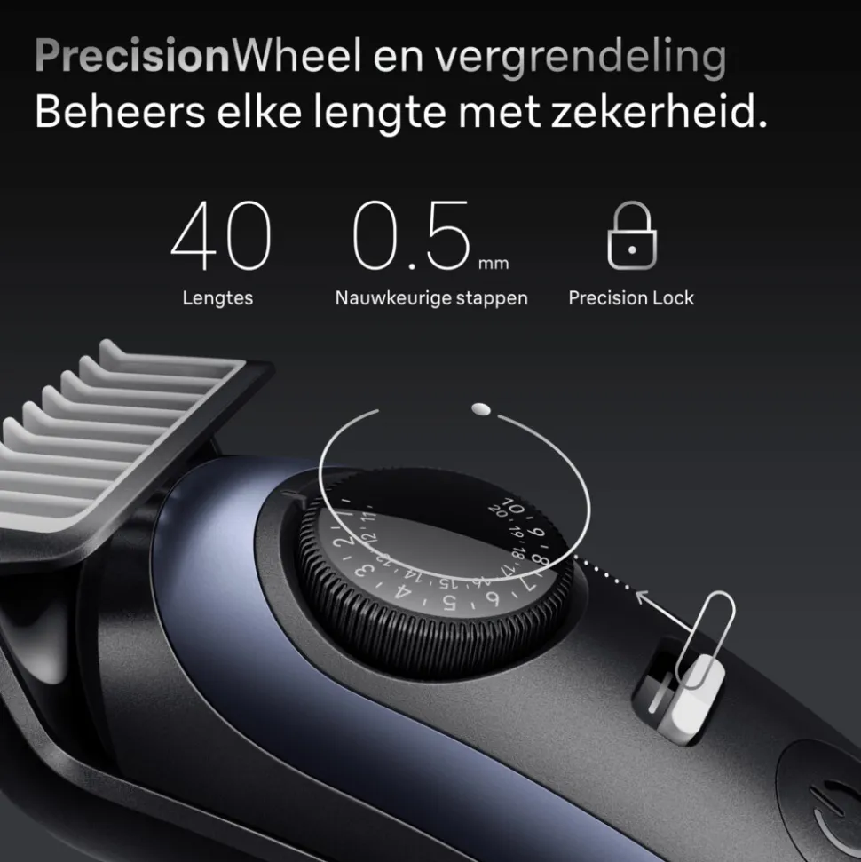 - Geen fouten meer: Blijf volledig in controle bij elke trimbeurt dankzij PrecisionLock en PrecisionWheel met 40 lengte-instellingen in stappen van 0,5 mm