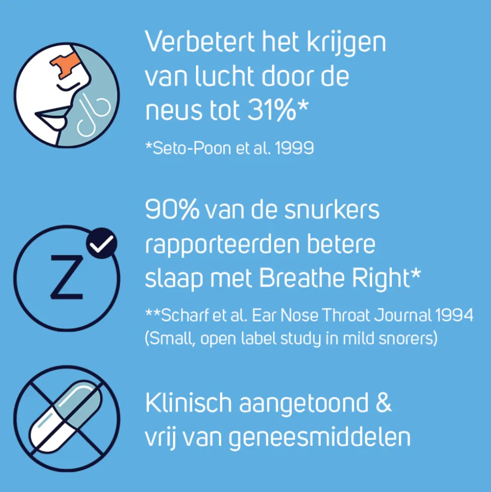Medisch hulpmiddel Breathe Right is een transparante, wereldwijd gepatenteerde neusstrip die helpt om tijdens de slaap vrijer door de neus te ademen. Ideaal als je neus verstopt zit of als je snurkt. De neusstrips zijn gemaakt van flexibele, veerachtige banden die precies boven de neusgaten passen. Doordat de twee vleugels proberen terug te keren naar hun oorspronkelijke vorm, heffen ze de zijkanten van de neus op en openen ze de neusholtes waardoor je meer lucht door de neus binnenkrijgt.