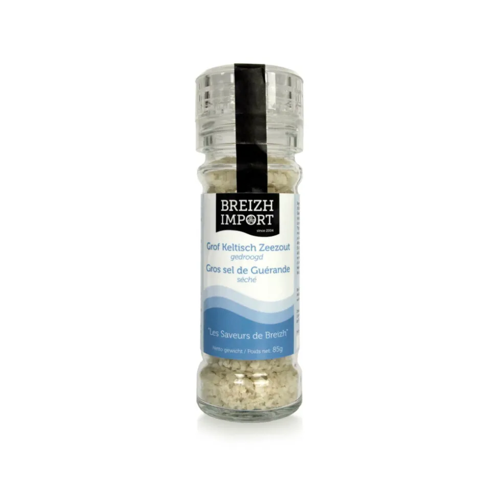 Grof Keltisch Zeezout Gedroogd van Breizh Import is ongerafineerd, mineraalrijk grof Keltisch gedroogd zeezout uit Guerande (Frankrijk) in handig molentje. Het zout is natuurzuiver, ongeraffineerd, mineraalrijk (o.a. magnesium, calcium en ijzer) en is gedroogd bij lage temperatuur, waardoor de samenstelling van het zout intact blijft. Het verschil met vochtig zeezout is dus alleen het percentage vocht (ca 4% t.o.v. 6 à 7% voor het vochtig zeezout).