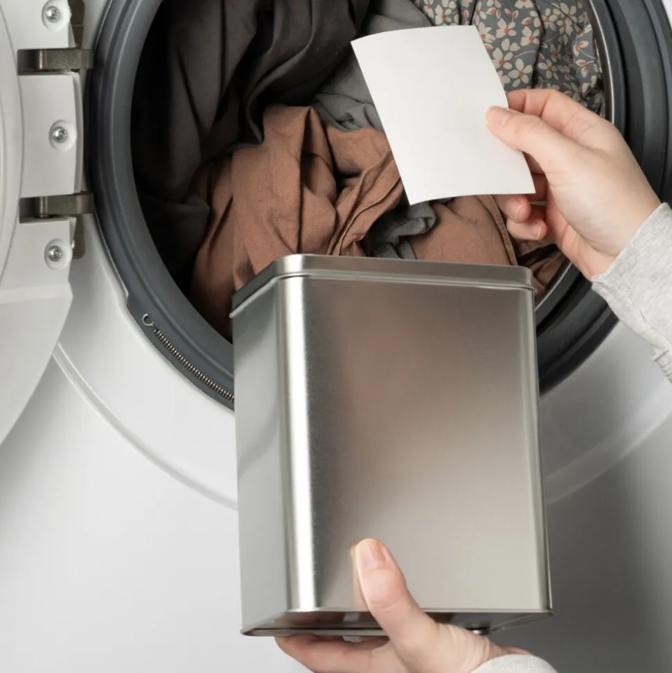 Stap de wasstrips netjes op elkaar in het blik en sluit het deksel goed af. Het blik biedt ruimte voor maximaal 200 wasstrips. Bewaar op een droge plaats, uit direct zonlicht.