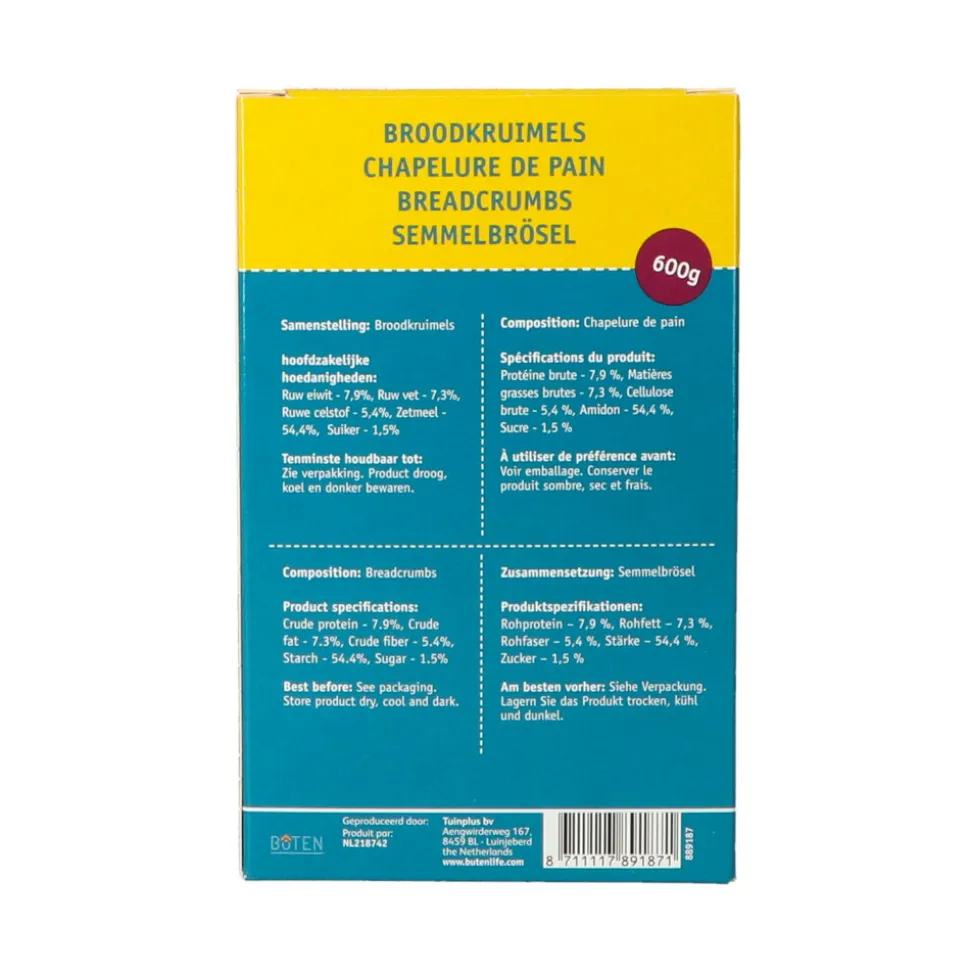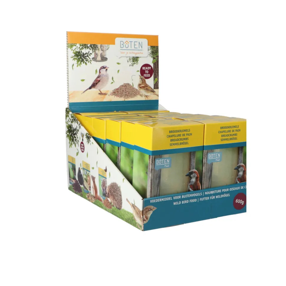 OntdekBûten Food Broodkruimels in Doosje – de ideale aanvulling voor vogels in je tuin. Deze broodkruimels zitten boordevol energie en zijn een smakelijke traktatie voor diverse vogelsoorten. Met zorg samengesteld om aan hun voedingsbehoeften te voldoen. Breng leven in je tuin met dit doosje vol voedzame broodkruimels.