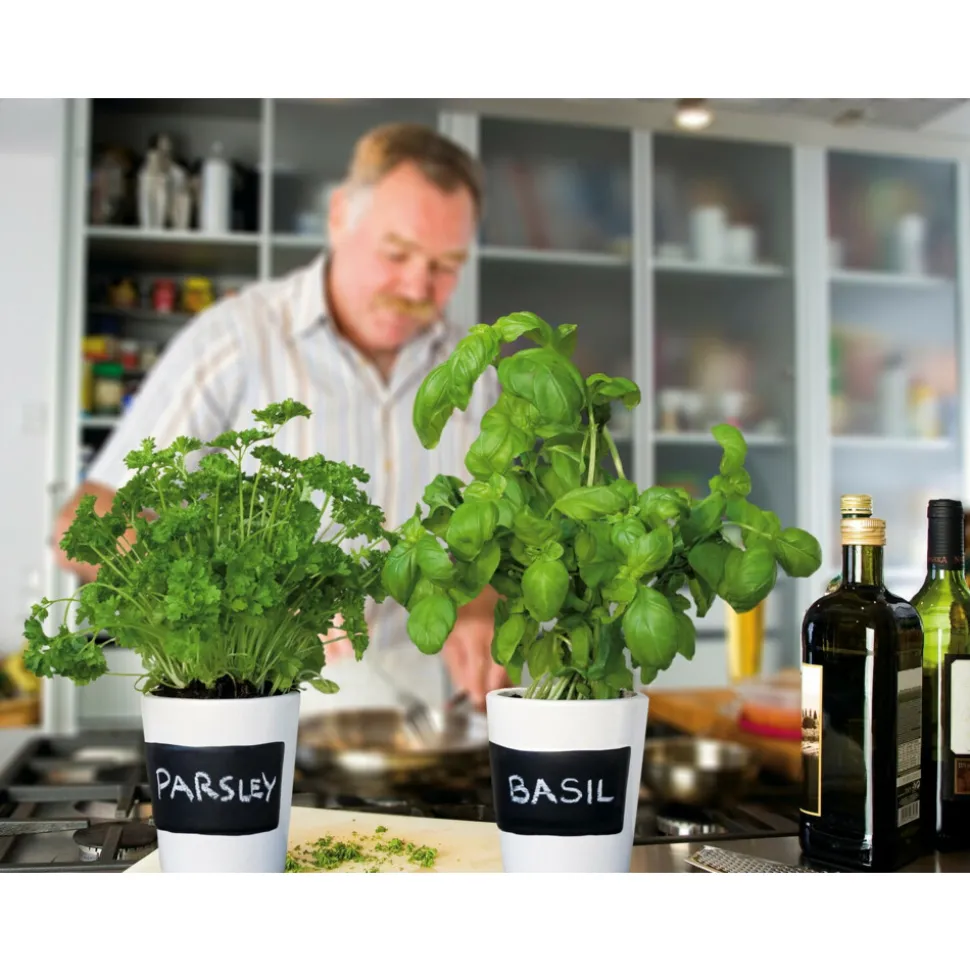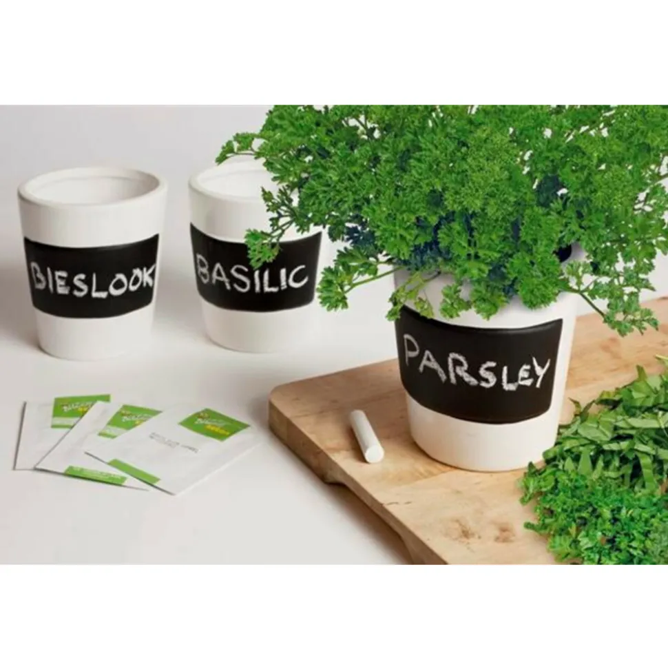 Kruiden set met drie witte krijt potten met een krijtje. Decoratieve keukenkruidenset inclusief 3 zakjes biologische kruidenzaden van: basilicum, peterselie en bieslook. Met bijgevoegde gebruiksaanwijzing en groeimedium kunt je direct aan de slag om jouw eigen verse keukenkruiden te kweken.