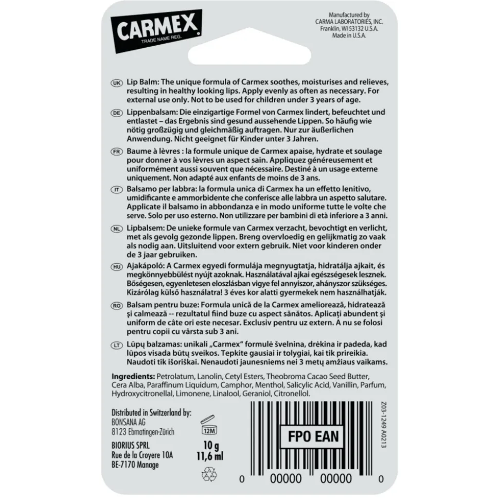 Carmex Lippenbalsem Classic is dé klassieke lipverzorging uit de Verenigde Staten, met alleen de beste ingrediënten! Carmex lippenbalsem is ideaal voor het verzachten, hydrateren en verzorgen van droge en ruwe lippen. Het biedt een goede bescherming tijdens het skiën, snowboarden, hardlopen, fietsen en alle andere buitensporten én doet wonderen als basis onder lipcosmetica. Verkrijgbaar in pot, tube en stick.