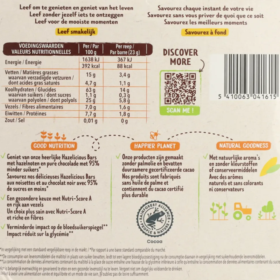 Rijstmeel 35,6%, zoetstof: maltitolen, pure chocolade met zoetstof 17% (cacaomassa^1, zoetstof: maltitolen, cacaoboter^1, emulgator: lecithinen [soja], natuurlijk vanillearoma), stabilisatoren: sorbitolen en plantaardige glycerol, tarwedextrine, geroosterde hazelnoten 4,6%, oliezuurrijke zonnebloemolie, hazelnootpasta 3,3%, tarwegluten, natuurlijk hazelnootaroma, magere cacaopoeder^1, emulgator: lecithinen.