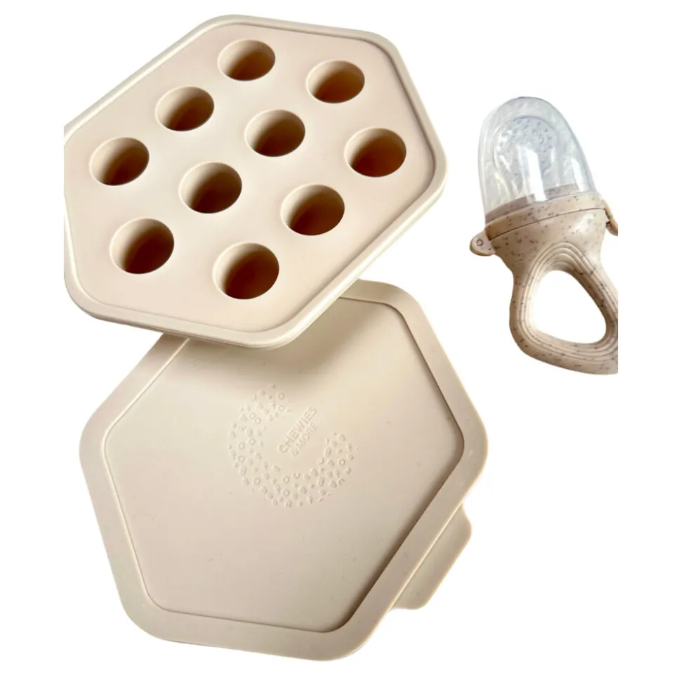 De Chewies&more Fruitspeen Set in beige is ideaal voor kleintjes vanaf 4 maanden. Deze complete set bevat een fruitspeen, een ijsblokjes tray en siliconen spenen in drie maten (S, M & L). Je maakt eenvoudig passende ijsblokjes met fruit, groente, smoothies, water of borstvoeding. Perfect voor het verlichten van doorkomende tandjes én het ontdekken van nieuwe smaken. De silicone houder is los te maken en daardoor goed schoon te houden. Dankzij het dekseltje neem je de fruitspeen hygiënisch mee of bewaar je ‘m in de koelkast.