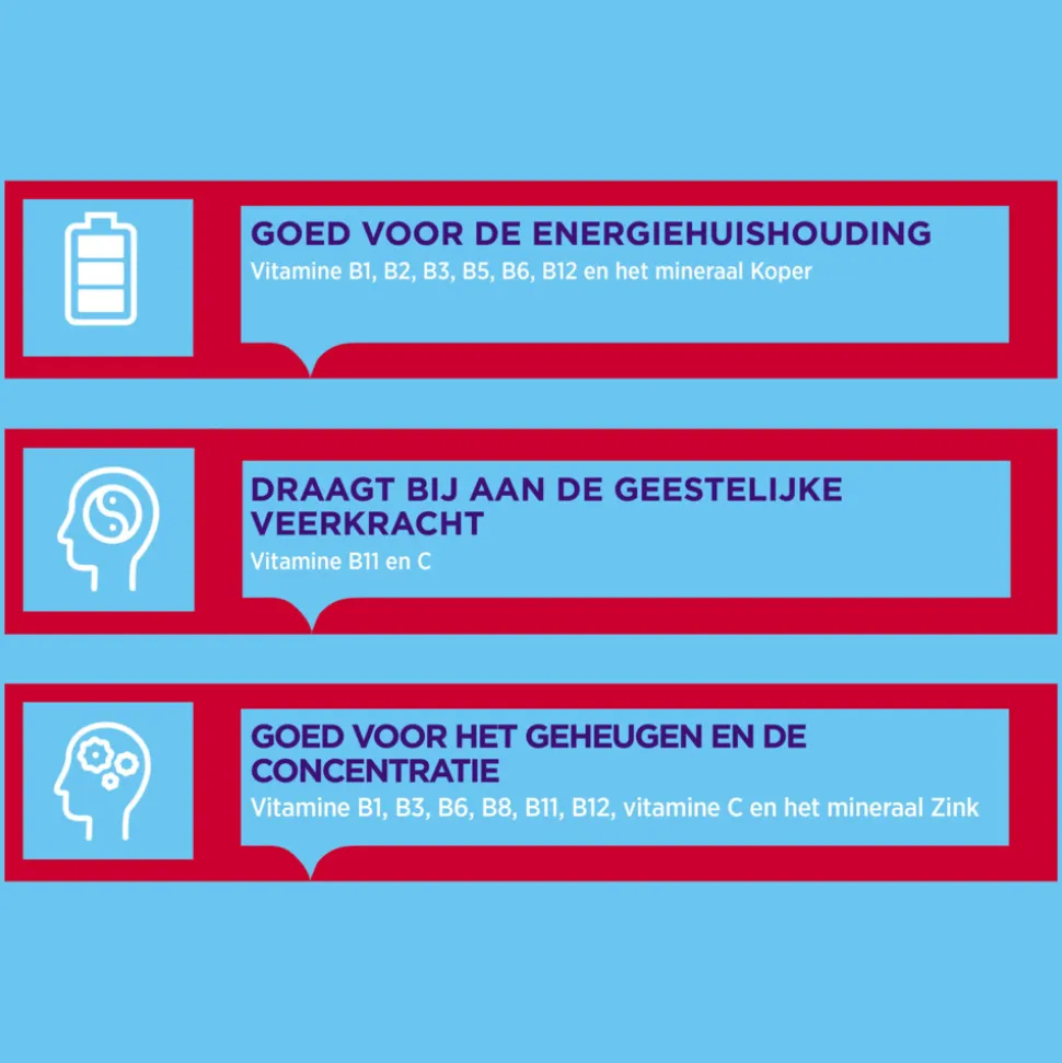 1: Vitamine B1, B2, B3, B5, B6, B12 en het mineraal koper dragen bij aan een goede energiehuishouding.