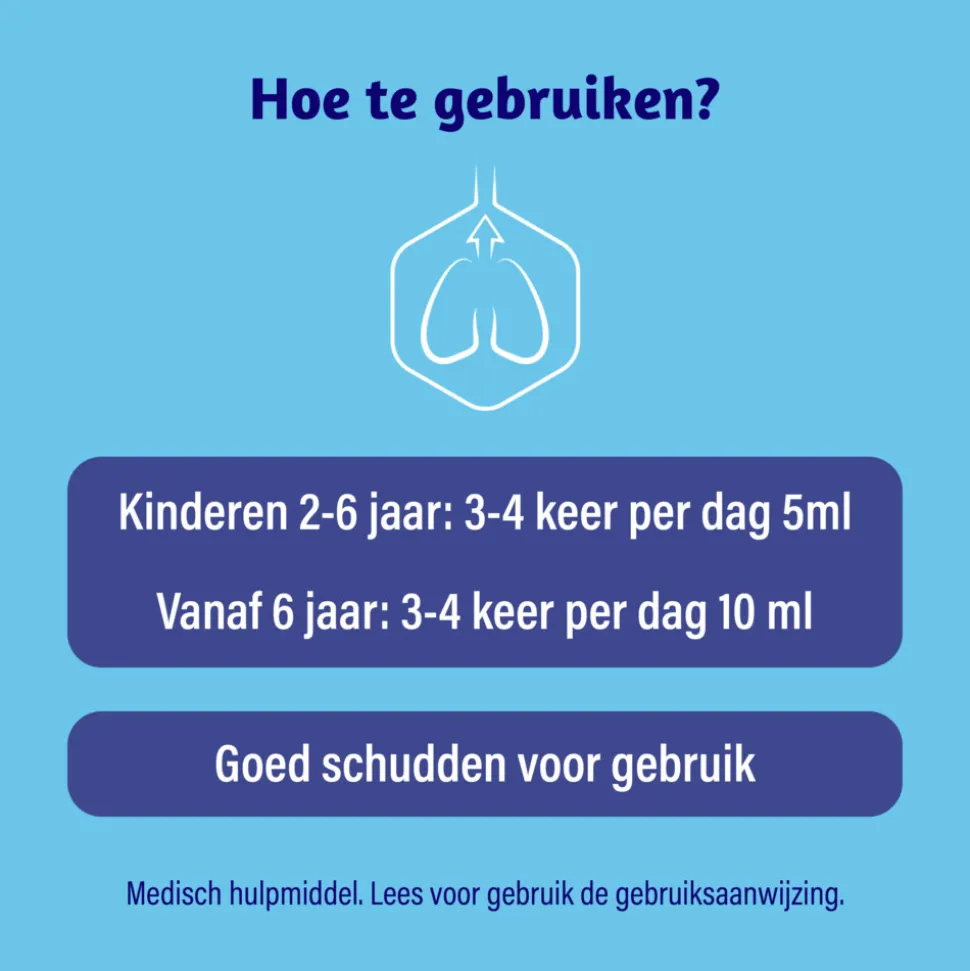Dosering; * Kinderen van 2-6 jaar: 3-4 keer per dag 5ml * Vanaf 6 jaar en volwassenen: 3-4 keer per dag 10 ml. Goed schudden voor gebruik en lees voor gebruik de gebruiksaanwijzing. Te gebruiken voor kinderen vanaf 2 jaar onder toezicht van volwassenen. Alleen voor oraal gebruik. Niet gebruiken bij overgevoeligheid voor één van de ingrediënten. Niet geschikt voor diabetici. Raadpleeg voor gebruik eerst de huisarts tijdens zwangerschap en borstvoeding.