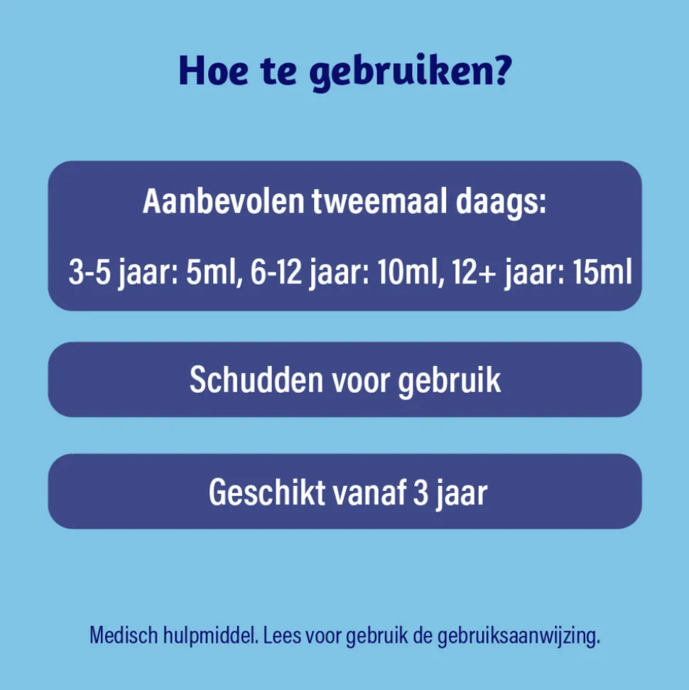 - Voor kinderen van 3 tot 5 jaar: 5 ml per keer / 2-3 keer per dag