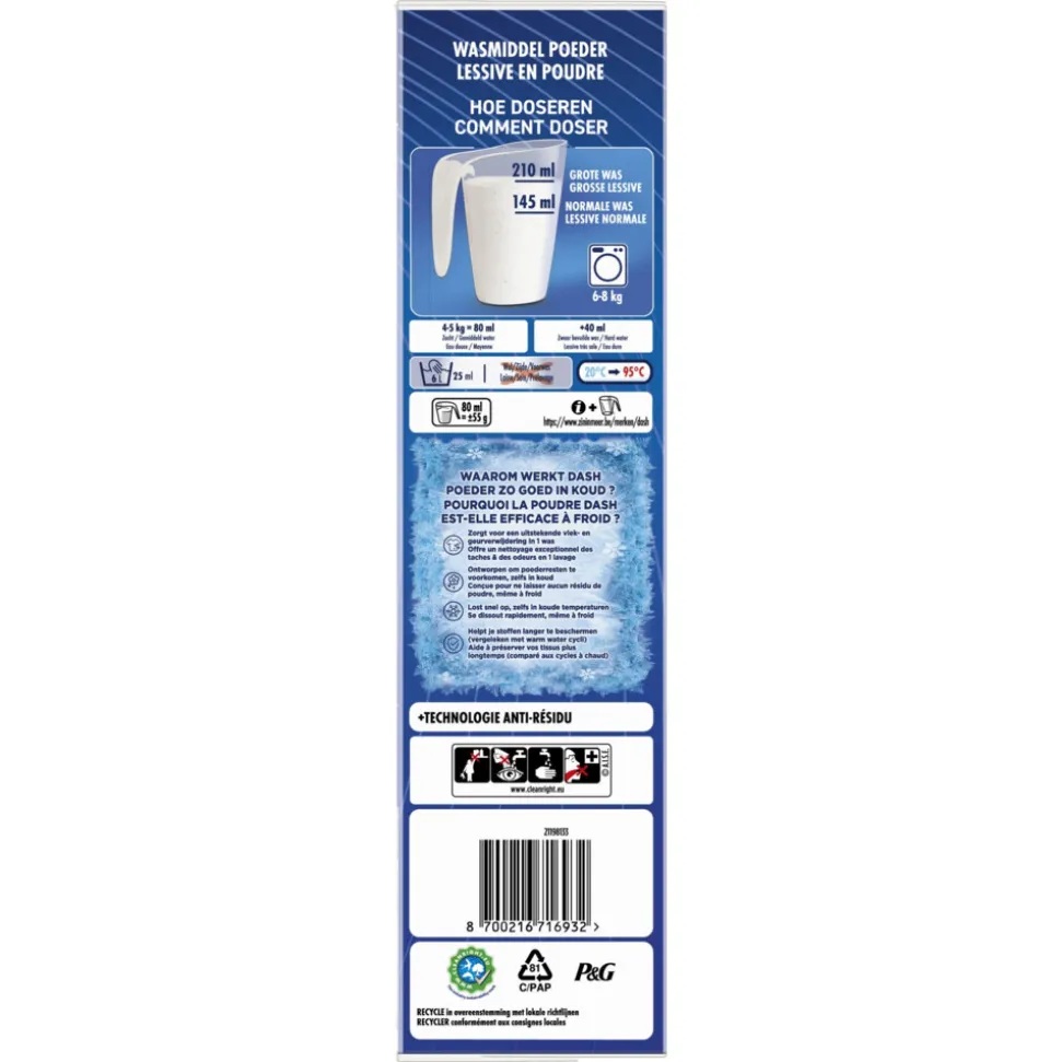 Dash Witter Dan Wit + Anti-Residu technologie waspoeder biedt briljant schone resultaten, zelfs bij een koud en kort cyclus. Dankzij de innovatieve snelle oplostechnologie lost het waspoeder snel op bij contact met water, wordt het direct geactiveerd en dringt het diep in de vezels door, zelfs in koud water. Daarnaast is Dash Witter Dan Wit waspoeder voorzien van unieke anti-residutechnologie die helpt voorkomen dat er poederresten op je kleding achterblijven. Bovendien zorgt de geconcentreerde formule van Dash voor een krachtige reiniging, waardoor je meer wasgoed per gram kunt wassen.