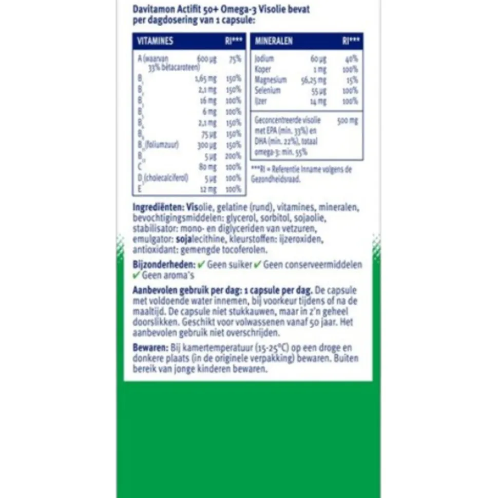 Davitamon Actifit 50+ Omega-3 Visolie is speciaal voor volwassenen vanaf 50 jaar. Davitamon Actifit 50 Plus Omega-3 Visollie combineert vitamines, mineralen en zuivere visolie met 55% omega-3 vetzuren in een capsule per dag. Deze formule is goed voor het hart, hersenen, de weerstand, het energieniveau en het behoud van sterke botten. De toegevoegde visolie bevat namelijk de unieke omega-3 vetzuren EPA en DHA die, bij dagelijkse inname van 250 mg EPA en DHA, bijdragen aan het goed blijven functioneren van het hart. Daarnaast is DHA, bij dagelijkse inname van 250 mg, een belangrijke bouwsteen voor de hersenen en is het goed voor het gezichtsvermogen, om scherp te blijven zien.