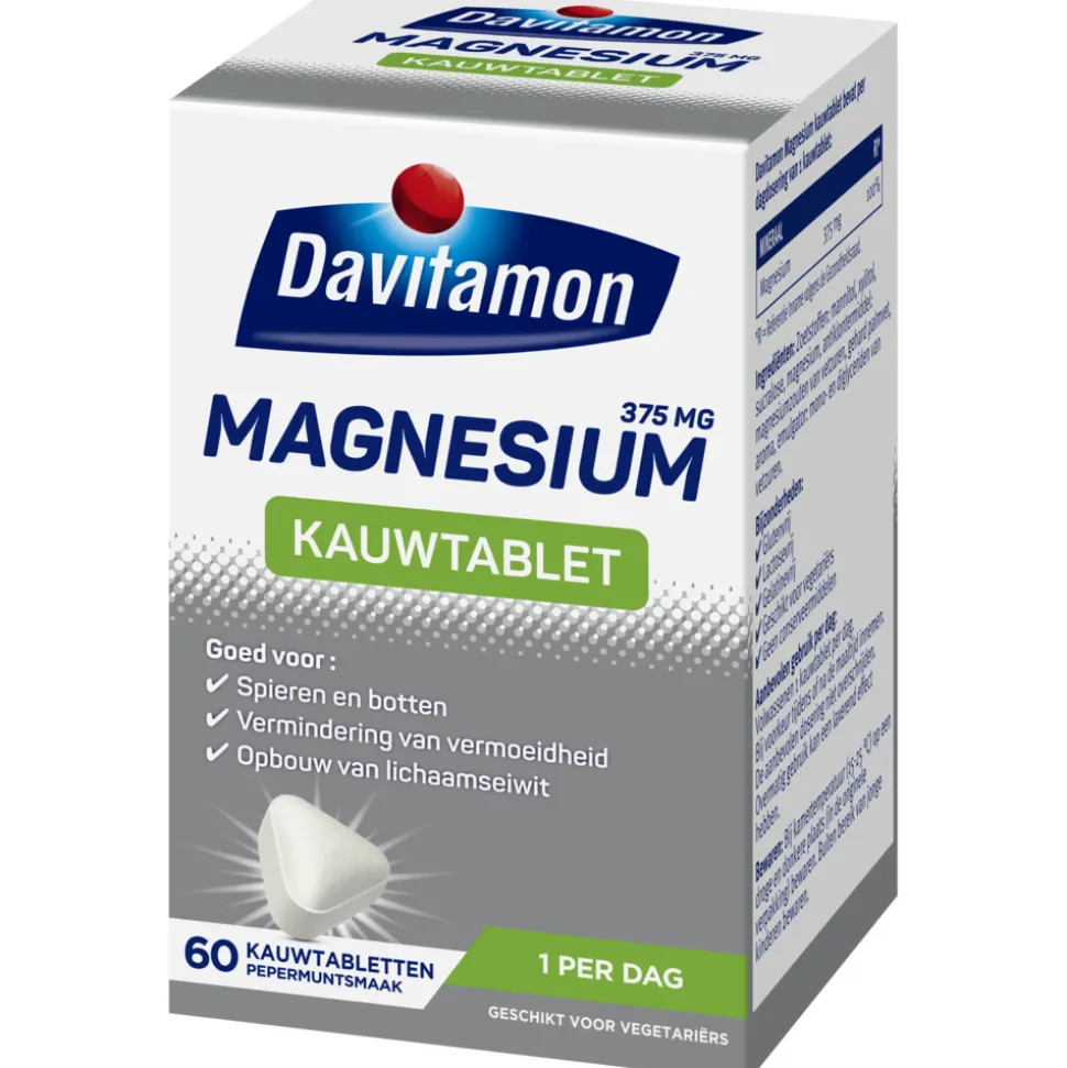 Davitamon Magnesium Kauwtablet bevatten wel 375mg magnesiumoxide per kauwtablet. Magnesium ondersteunt het behoud van soepele spieren en sterke botten, bevordert het de energiestofwisseling en helpt het dus bij futloosheid en vermoeidheid. Daarnaast zorgt magnesium voor het goed functioneren van het zenuwstelsel, concentratievermogen en de opbouw van lichaamseiwit. Magnesium helpt bij het vrijmaken van energie uit voeding.