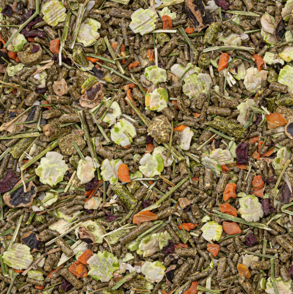 Zonnebloemzaadmeel, luzerne, erwtenvlokken, bietenpulp, johannesbrood, timotee hooi (5%), kool- en raapzaadmeel, wortel gedroogd (4%), luzernestro (3%), (suiker)bietmelasse, rode biet gedroogd (2%), palmolie, peterselie (1%), monocalciumfosfaat, natriumchloride, calciumcarbonaat