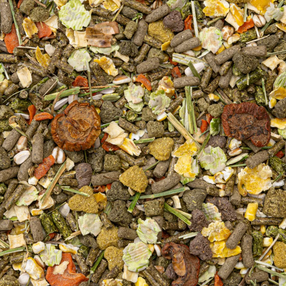 Luzerne (21%), erwtenvlokken (10%), zonnebloemzaadmeel, tarwezemelen, timoteehooi (6%), maisvlokken, haverschillen, appel gedroogd, luzernestro (3%), kool- en raapzaadmeel, erwtenvezels (2,6%), sojadoppen, maïszetmeel, geëxtrudeerde maïs, maïs gepoft, pastinaak gedroogd (2%), wortel gedroogd (2%), maïs, sojameel, geëxtrudeerde tarwe, hooi, gepofte tarwe, zonnebloemzaad, lijnzaadolie, calciumcarbonaat, (suiker)bietmelasse, peterselie (0,4%), dicalciumfosfaat, weegbree (0,2%), geëxtrudeerde gerst, natriumchloride, zonnebloemolie, gedroogde rode biet (0,1%), brandnetel (0,05%), lijnzaad, paardenbloem (0,05%), echinacea (0,05%), kamille (0,04%), aardbeibladeren, kurkuma (0,03%), oregano (0,02%).