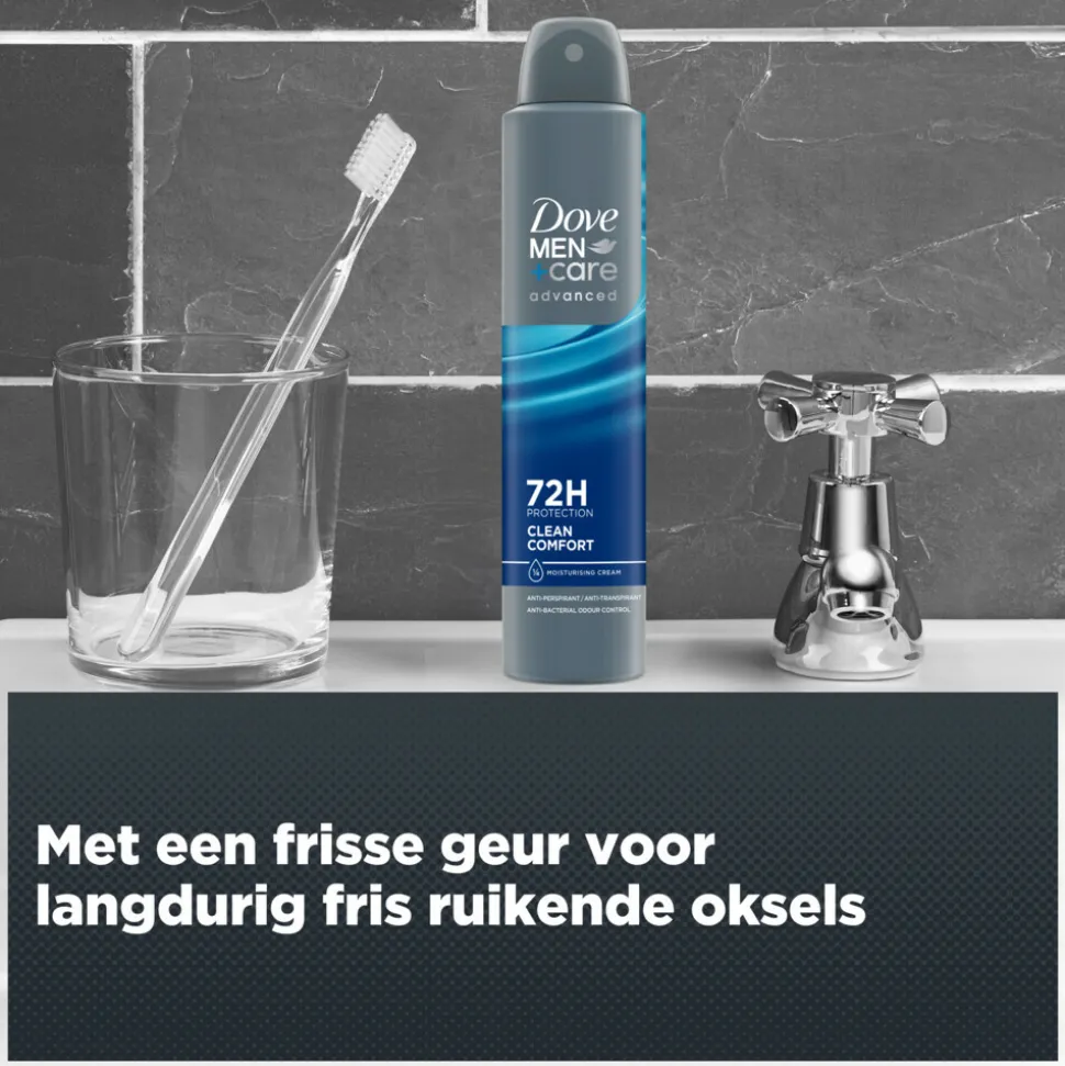 Dove Men+Care Advanced Clean Comfort Anti-Transpirant Deodorant Spray met anti-bacteriële geurbestrijding biedt tot 72 uur lang krachtige bescherming tegen zweet en nare geurtjes.