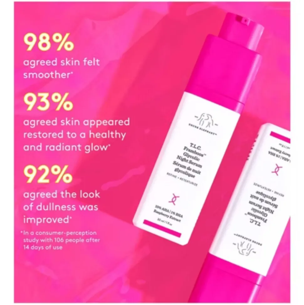 Het Drunk Elephant T.L.C. Framboos Glycolic Night Serum is een krachtig nachtserum dat de huid exfolieert en vernieuwt terwijl je slaapt. Het serum bevat 12% glycolzuur en frambozenextracten die de huidtextuur verbeteren, poriën verfijnen en fijne lijntjes verminderen. Daarnaast bevat het ook salicylzuur en melkzuur voor een egale en stralende teint. Dit serum is geschikt voor alle huidtypes en zorgt voor een zachte en gladde huid bij regelmatig gebruik.