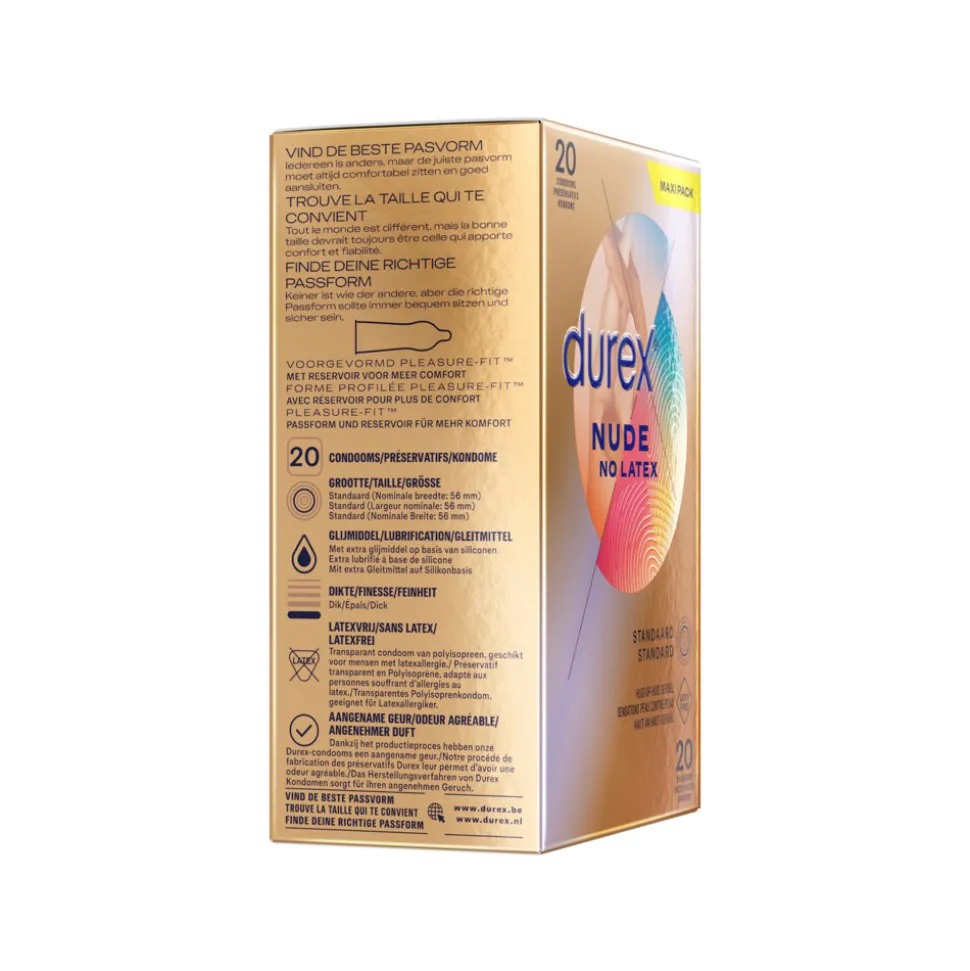 - De Durex Nude No Latex condooms zijn gemaakt van polyisopreen om het risico op latexallergieen te minimaliseren en voor een huid-op-huid gevoel. Als u toch irritatie ondervindt of een allergische reactiekrijgt, stop dan het gebruik en raadpleeg een arts.